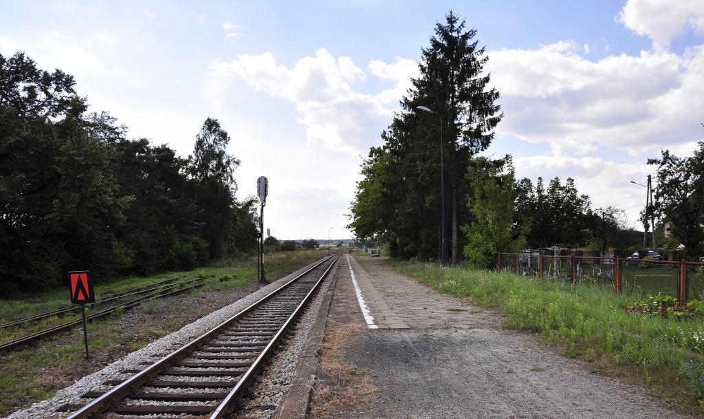 Widok na peron od strony wjazdu z Opola. Na wprost, za drzewem stoi nieczynny dworzec.