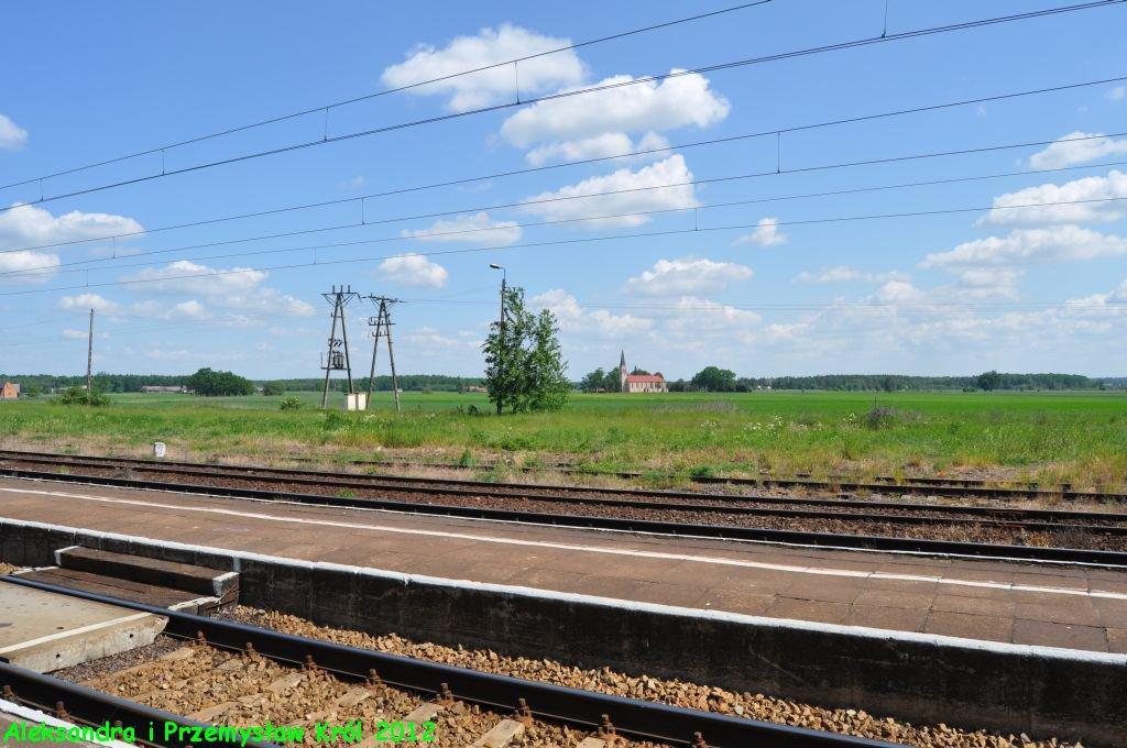 Widok na budynek dworca wraz z nastawnią od strony drogi do miejscowości.