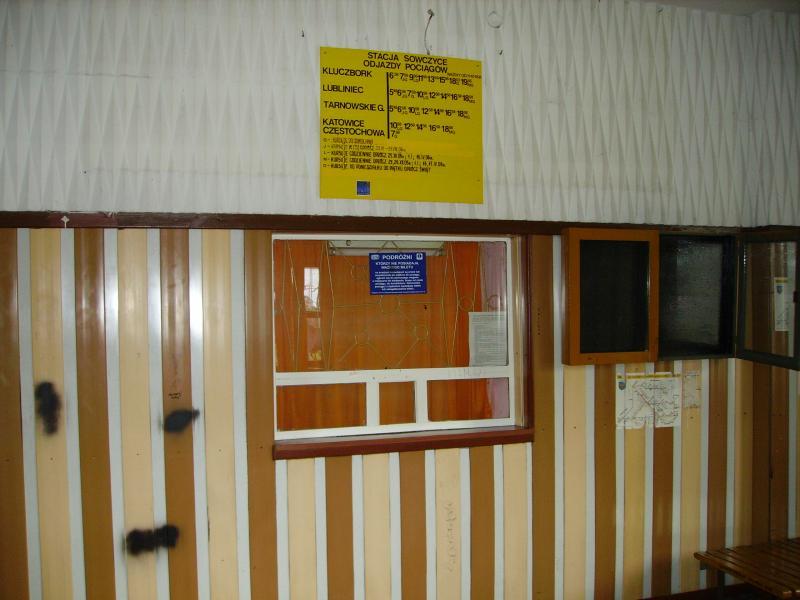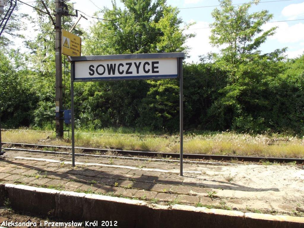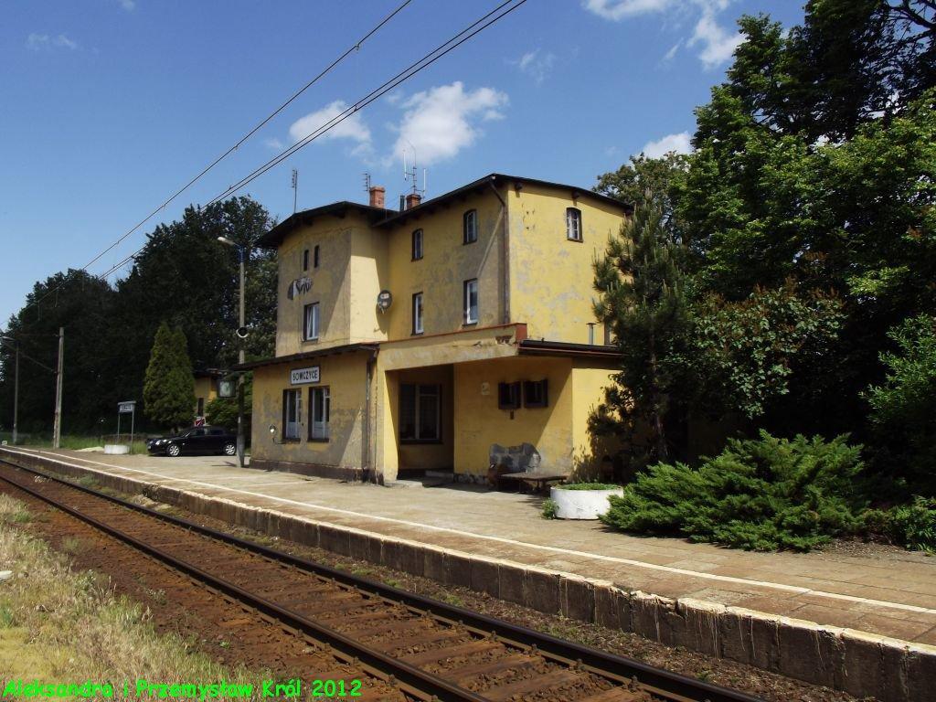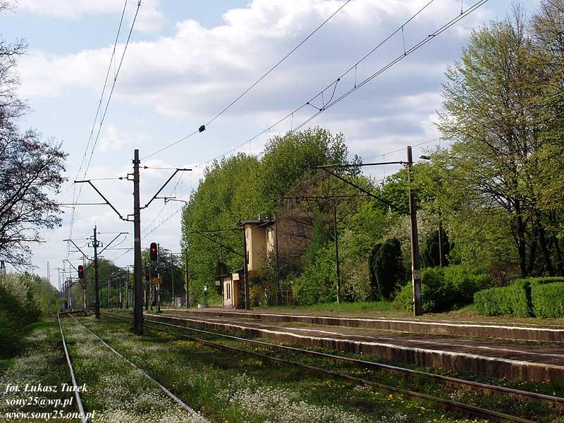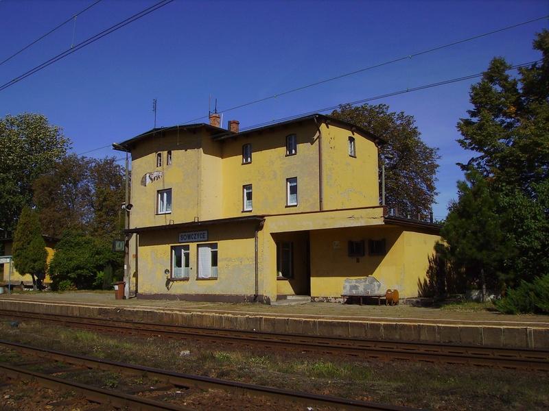 Sowczyce. Widok ogólny na stację od strony Lublińca. W tle budynek dworca. Na parterze mieści się nastawnia dysponująca.