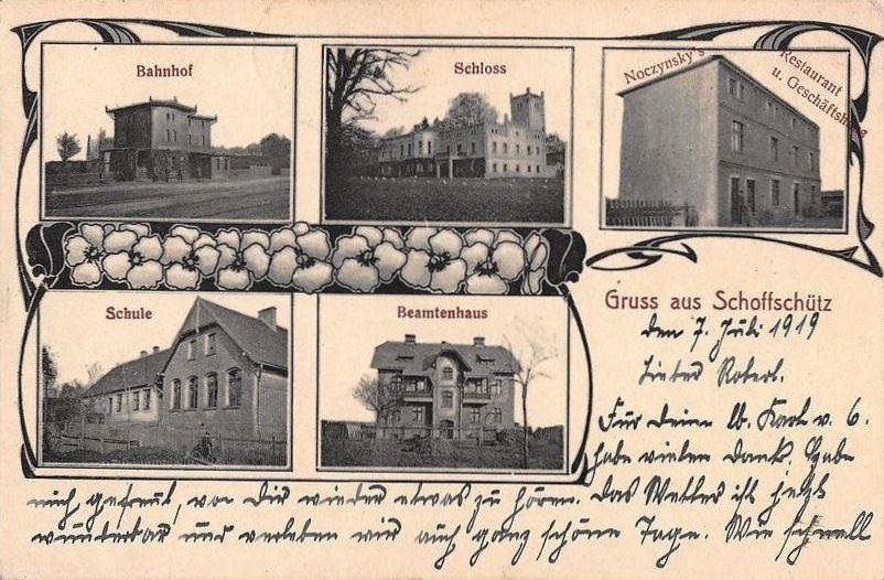 Stara pocztówka. W lewym, dolnym polu fragment budynku dworca.