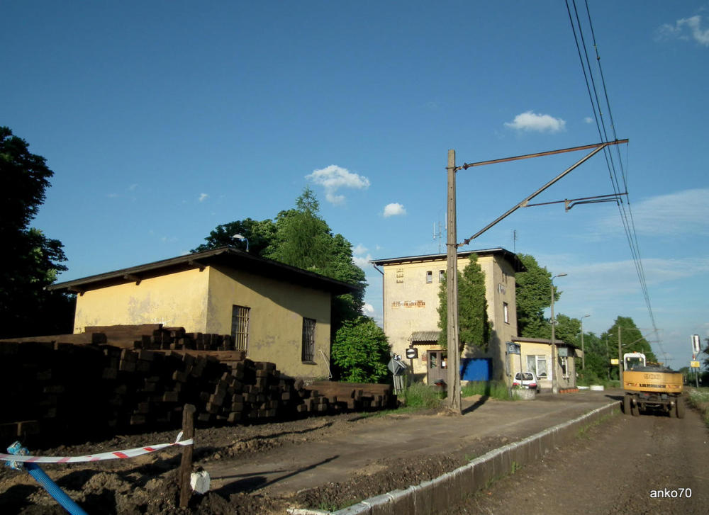 Stacja i linia w remoncie. Z lewej magazyn towarowy, odcięty od sieci. W tle budynek dworca z nastawnią dysponująca na parterze. Widok od strony wjazdu z Olesna/Kluczborka.