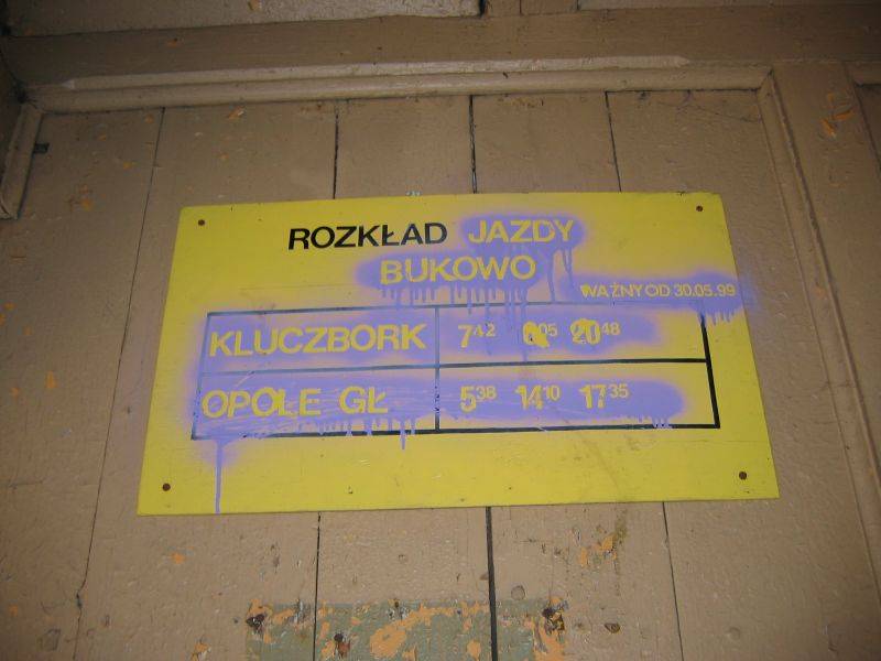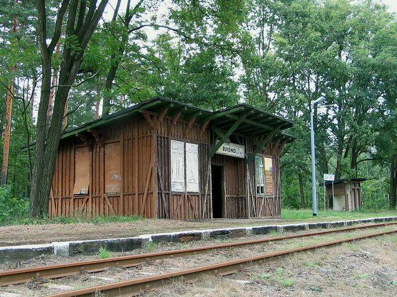 Bukowo. Widok w kierunku Kluczborka. Po lewej stronie peron oraz budynek dworca.