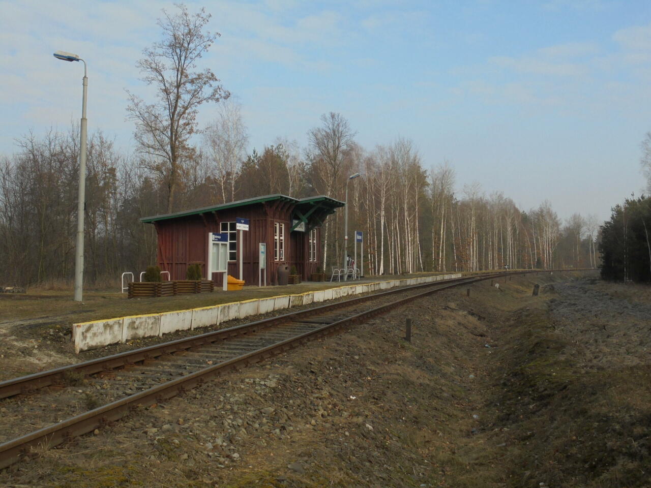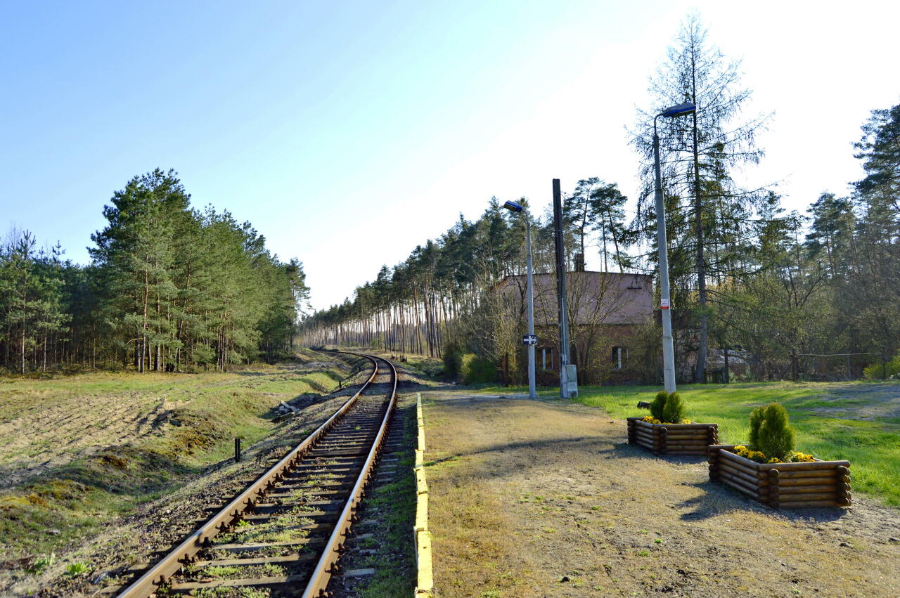 Początek peronu od strony Kluczborka. Najpierw, z drewnianą krawędzią nieużywana część, a dalej z płyt używana.