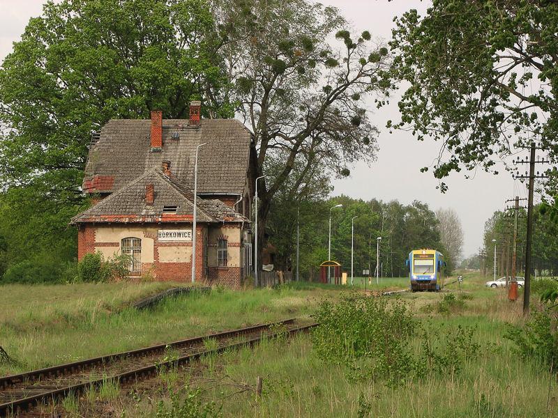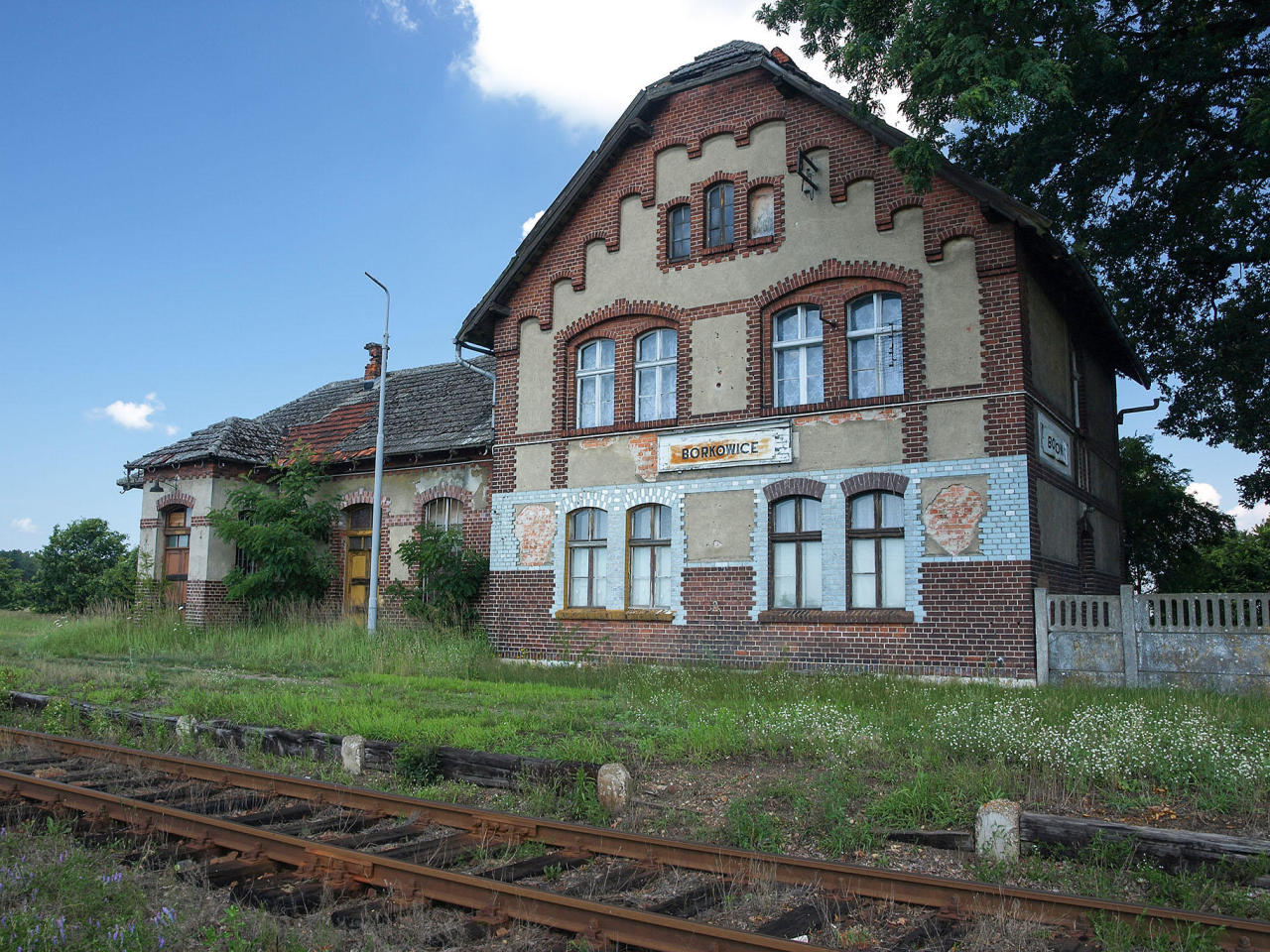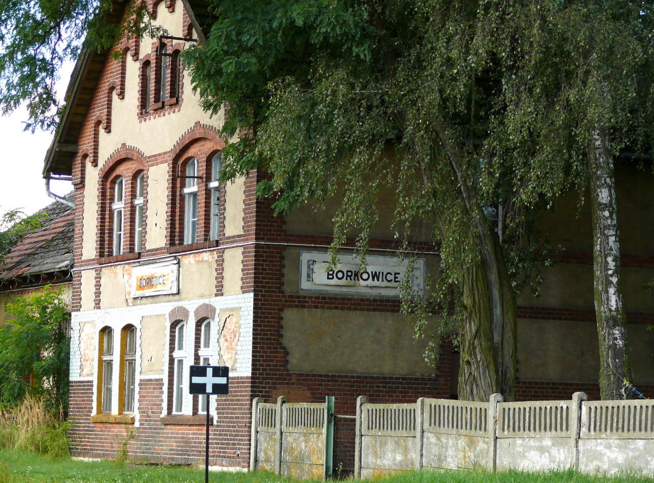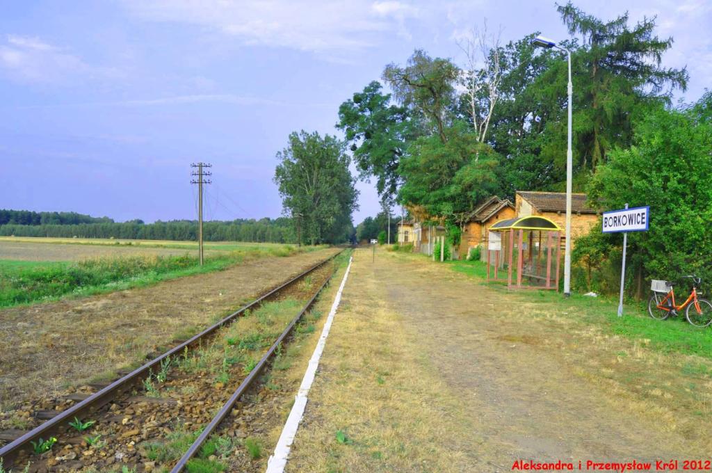 Na zdjęciu widzimy budynek stacyjny na przystanku Borkowice (widok w kierunku Kluczborka). Obecnie obsługa pasażerów odbywa się kilkanaście metrów od tego budynku. Pasażerowie czekają na szynobus pod wiatą, którą widać w tle. Miejsce wsiadania pasażerów wyznaczają białe linie. Peron całkowicie ziemny. Krawędzie są z drewna. Przystanek oddalony jakieś 200-300 metrów od miejscowości.