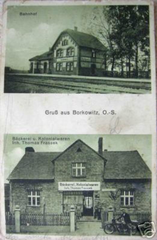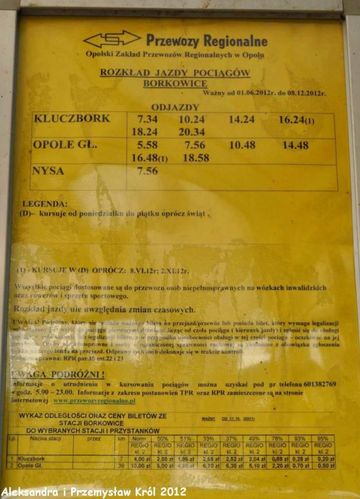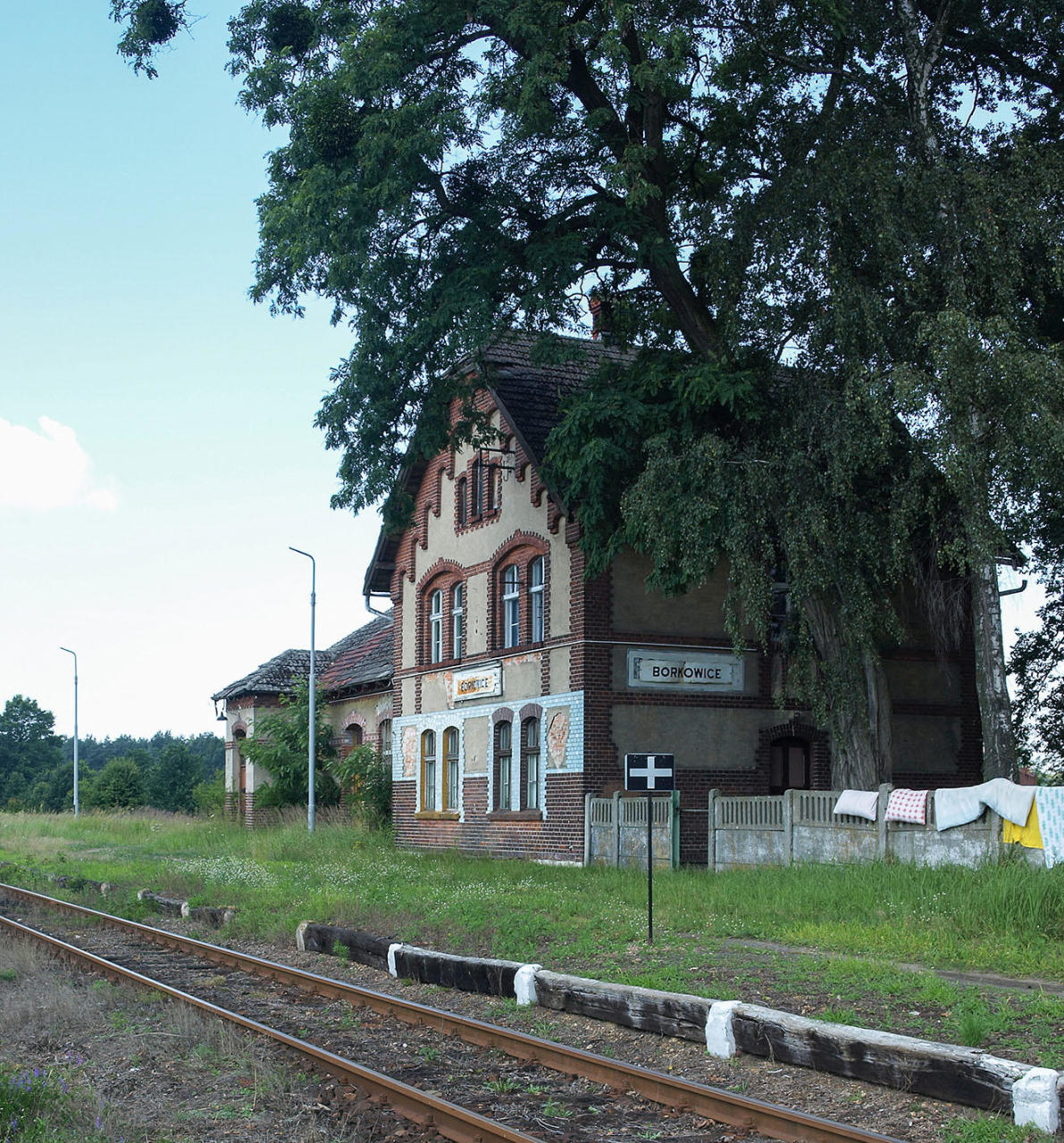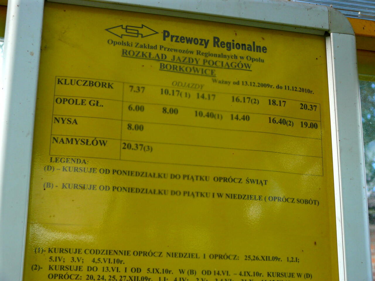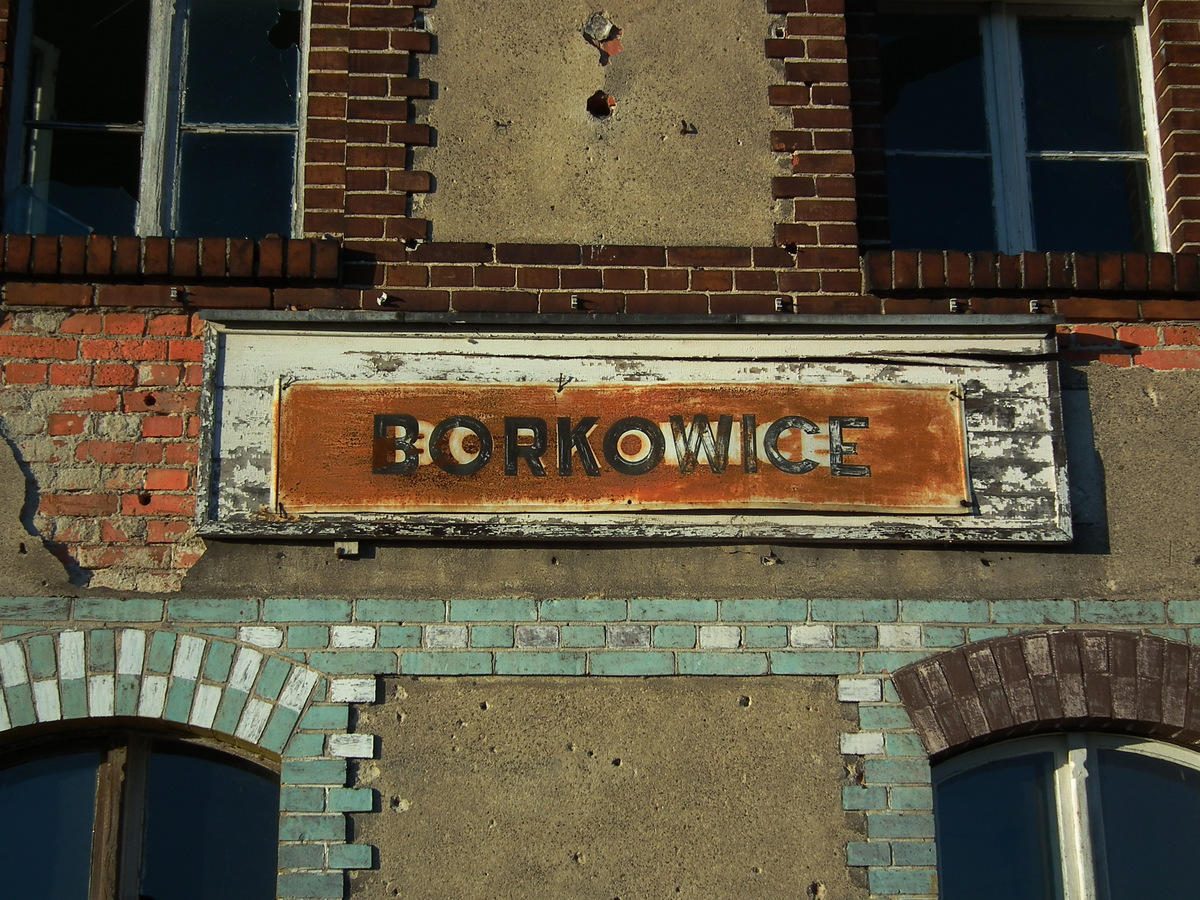 Na zdjęciu widzimy budynek stacyjny na przystanku Borkowice (widok w kierunku Kluczborka). Obecnie obsługa pasażerów odbywa się kilkanaście metrów od tego budynku. Pasażerowie czekają na szynobus pod wiatą, którą widać w tle. Miejsce wsiadania pasażerów wyznaczają białe linie. Peron całkowicie ziemny. Krawędzie są z drewna. Przystanek oddalony jakieś 200-300 metrów od miejscowości.