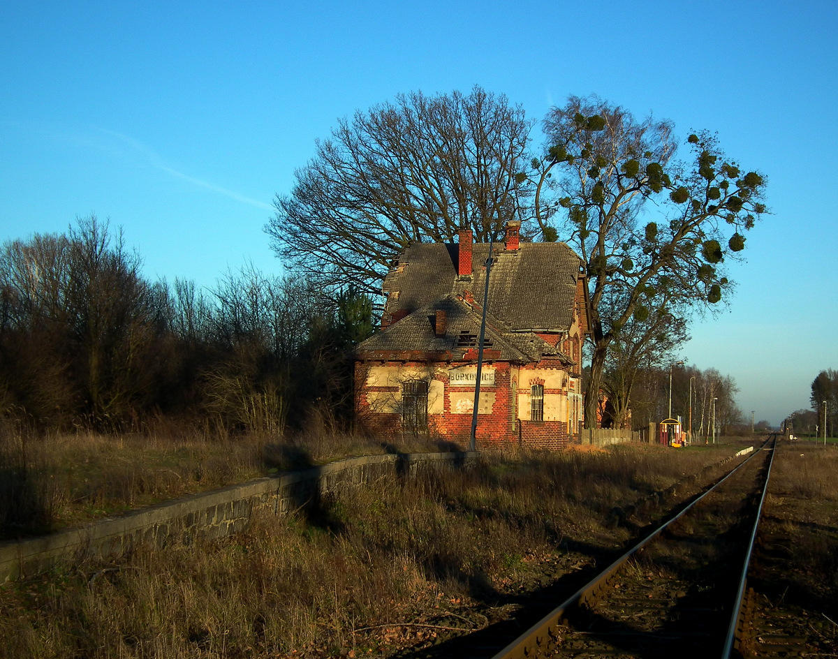 Budynek dworca opuszczony, pewnie podzieli los innych na linii i zostanie rozebrany? W lewo Jełowa/Opole, w prawo Kluczbork.