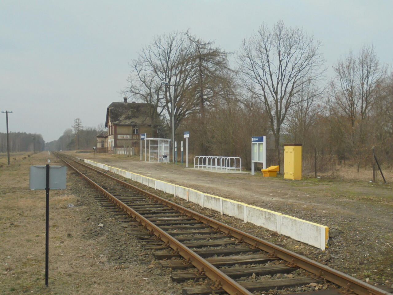 Widok na peron w kierunku Jełowej/Opola. Z prawej (poza kadrem) budynek dworca. Z lewej pozostałość po rozebranym torze dodatkowym.