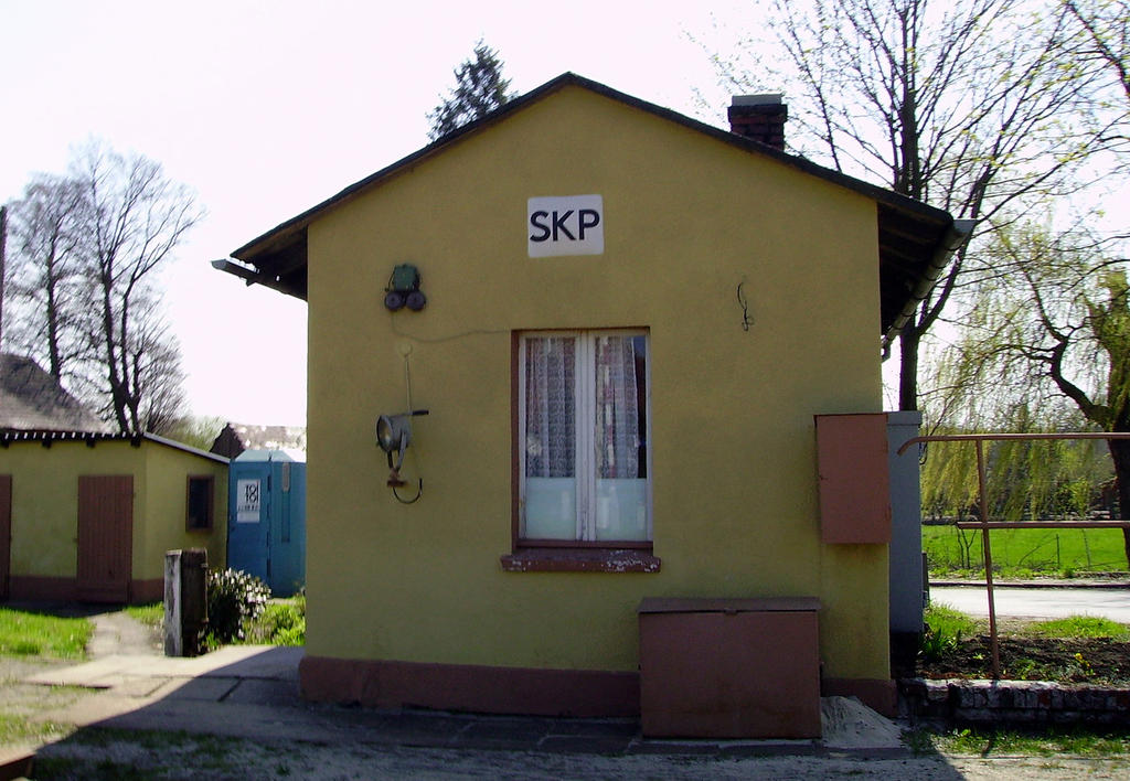Dróżnik i Skp na przy przejeździe kolejowym z ul. Daniecką, na wylocie na Opole (w prawo). Widok od strony torów; w lewo peron.