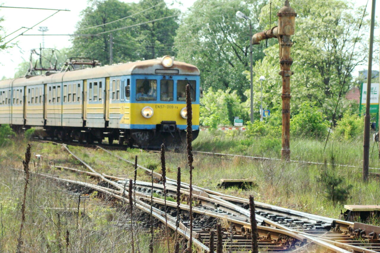 Ozimek. Pociąg z Opola Głównego prowadzony EN57-009.