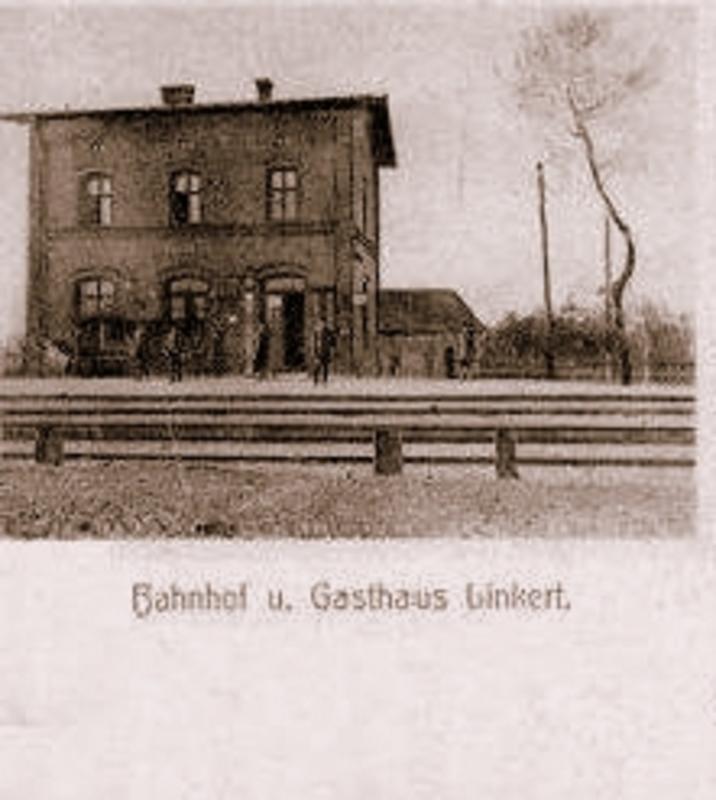 W prawym, górnym polu budynek dworca od strony podjazdu. Stara pocztówka.