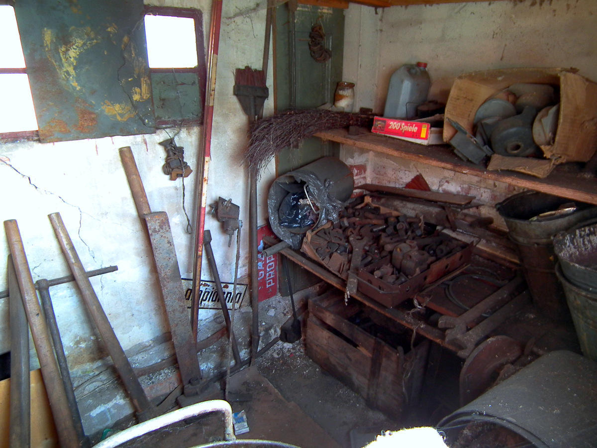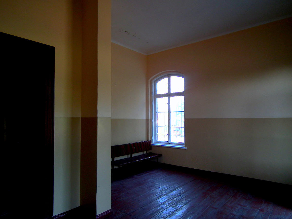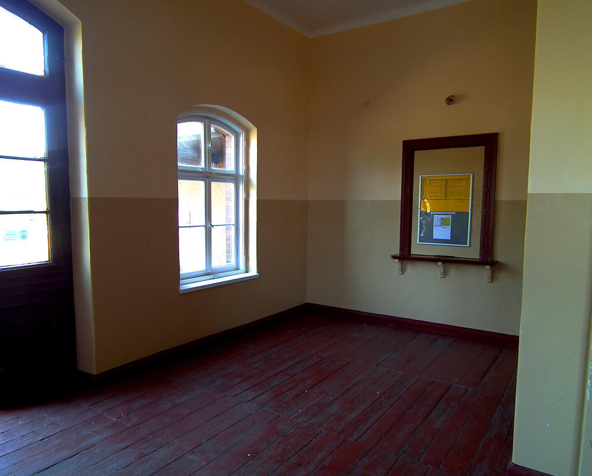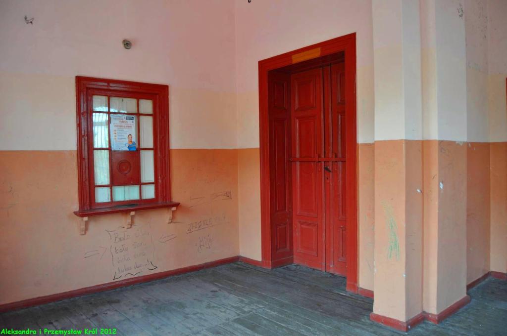 Widok przez okno do wnętrza małego budyneczku na przeciw dworca [może dawna waga wagonowa?] Choć można wypatrzeć tabliczkę LAMPIARNIA.