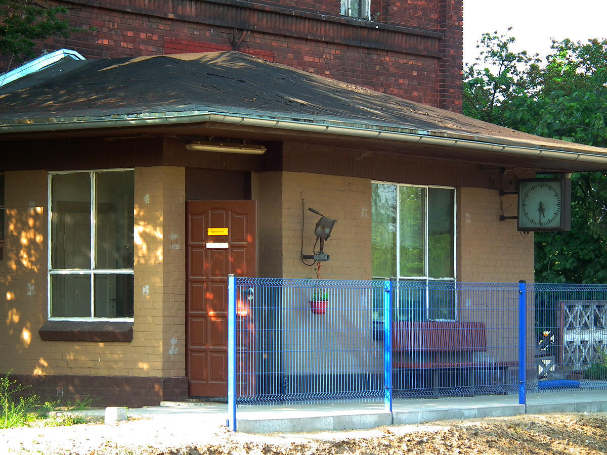 Budynek dworca i peronu. Drugi peron, to po prostu nasyp między torami. Na parterze, w przybudówce mieści się nastawnia dysponująca. Widok od strony wjazdu z Fosowskich.