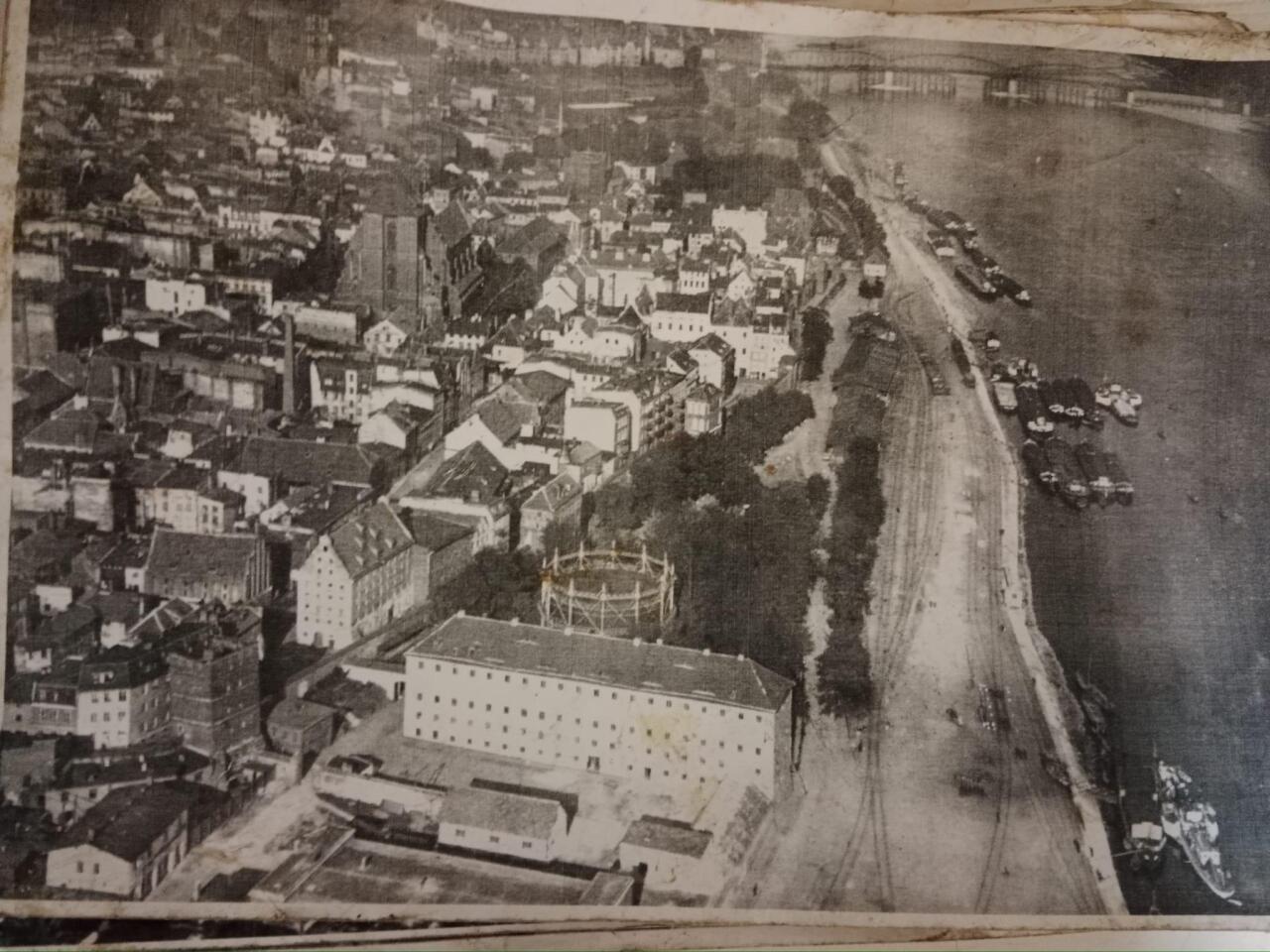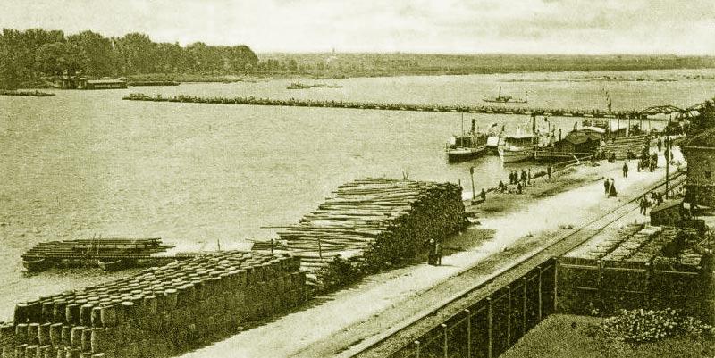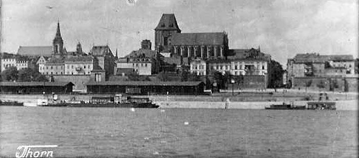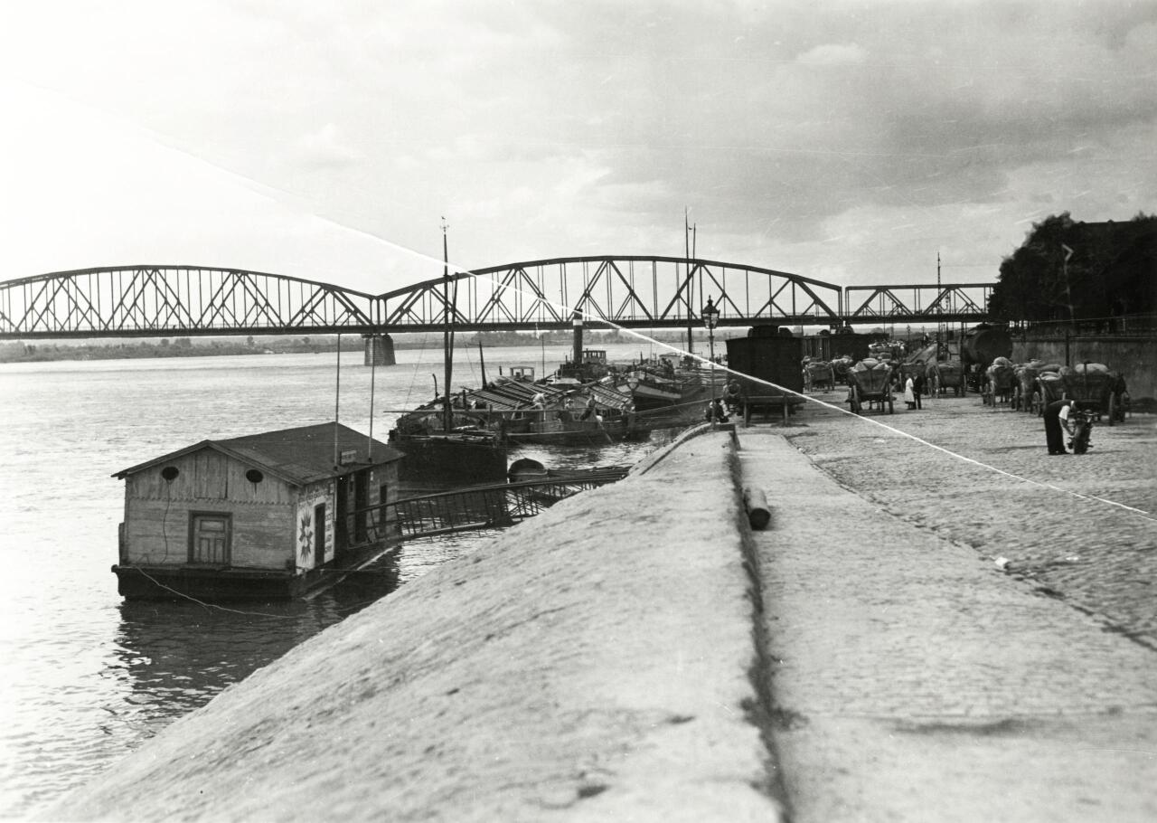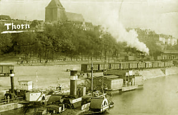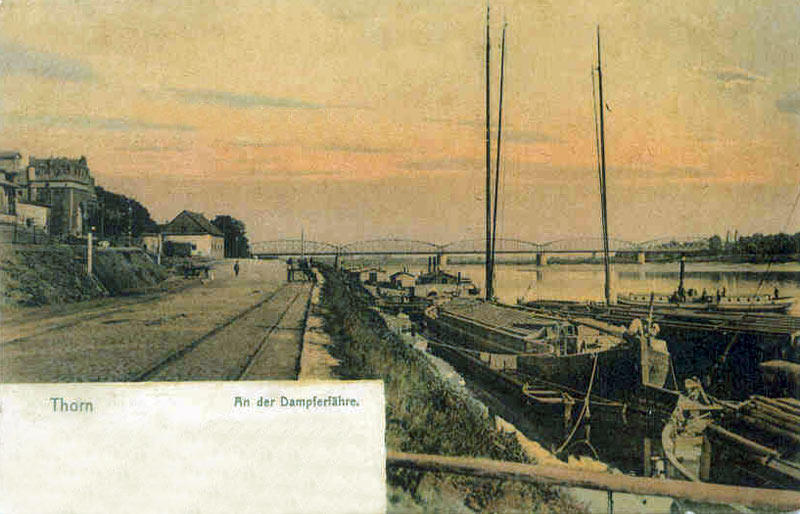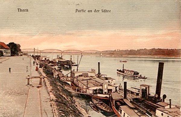 Toruń Nabrzeże po 1913 roku. Widok w kierunku wschodnim (Toruń Miasto); w tle most kolejowy nad Wisłą w ciągu obecnej linii kolejowej Poznań Wschód - Skandawa. Źródło: Forum dyskusyjne WMTMK Olsztyn.