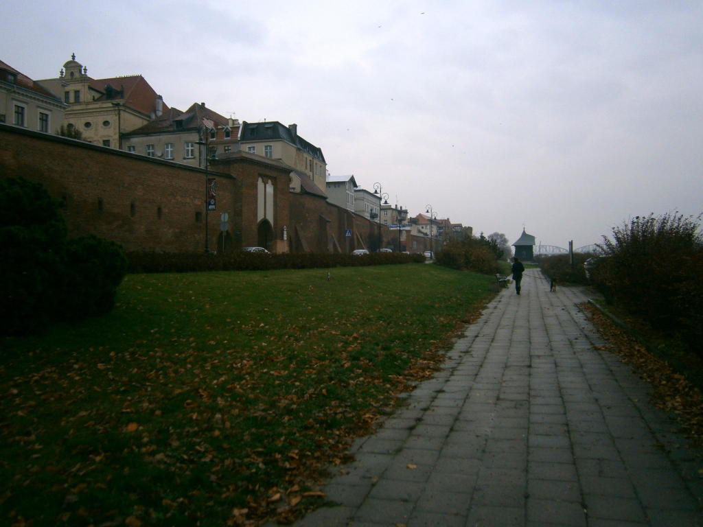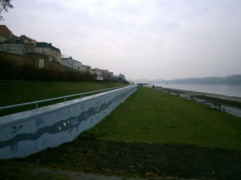 Nabrzeże Wisły w Toruniu - widoczne wagony i kozioł oporowy.