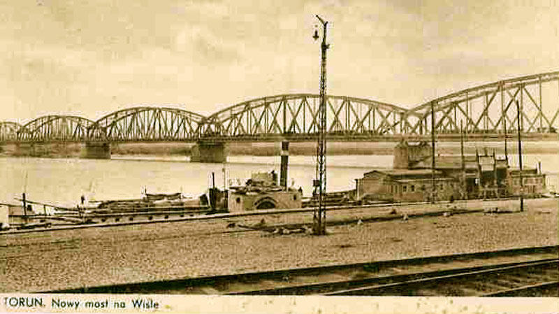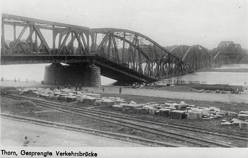 Stacja Toruń Nabrzeże - jesień 1939 roku. Widoczny zniszczony most drogowy im. Marszałka Józefa Piłsudskiego; wcześniejszy most kolejowy pod Kwidzynem. Widok w kierunku południowo-wschodnim; w lewo stacja Toruń Miasto. Źródło Forum dyskusyjne WMTMK Olsztyn