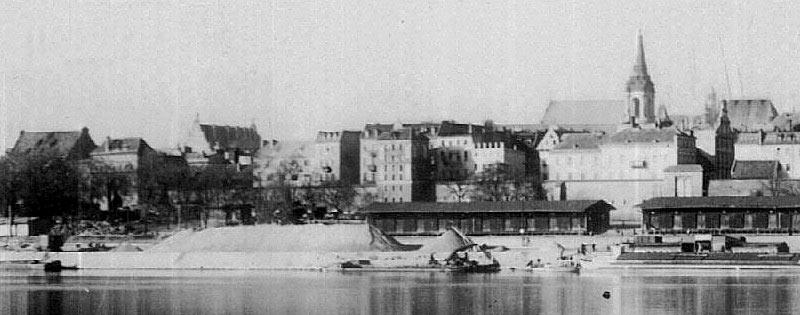 Stacja Toruń Nabrzeże po wybuchu II wojny światowej. Widok w kierunku wschodnim (Toruń Miasto); w tle zniszczony most kolejowy nad Wisłą w ciągu obecnej linii kolejowej Poznań Wschód - Skandawa oraz prowizoryczny most pontonowy. Źródło: Forum dyskusyjne WMTMK Olsztyn.