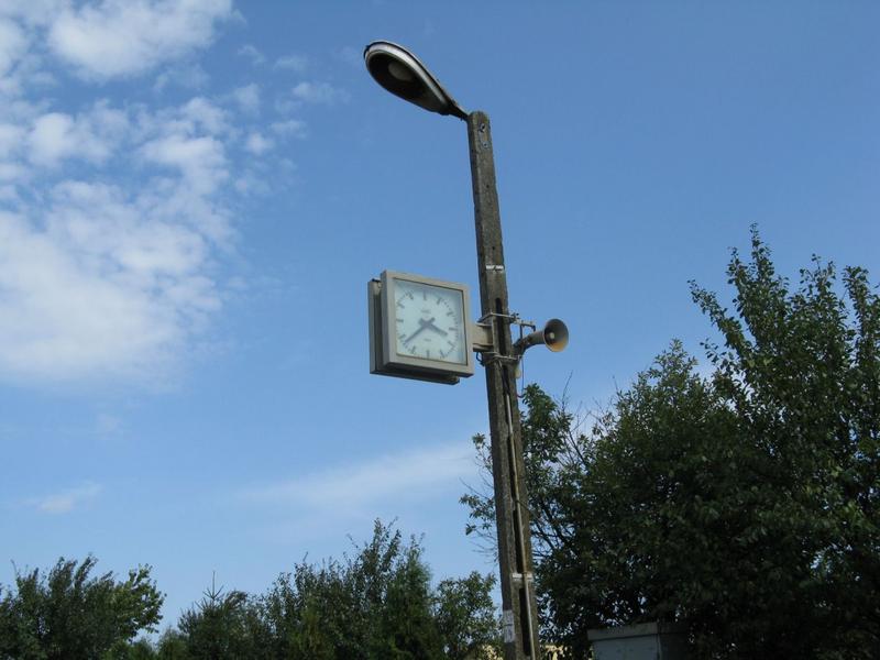 Lampa oświetlająca peron w Jaworznie, megafon i jedyny zegar, który zakończył swoją pracę o 15:38.