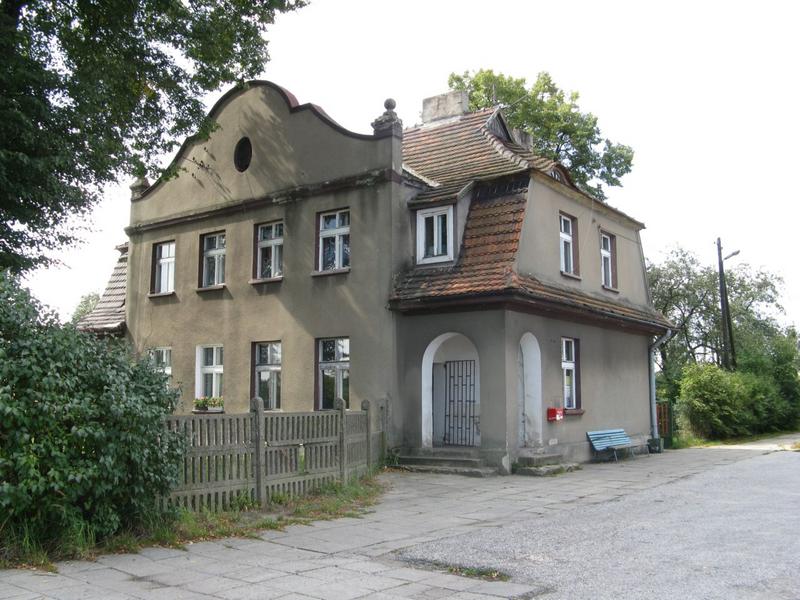 Budynek stacji Jaworzno koło Wielunia widziany od strony drogi. Oddalony kilkadziesiąt metrów od peronu, ale za to z czynną poczekalnią i kasą biletową.