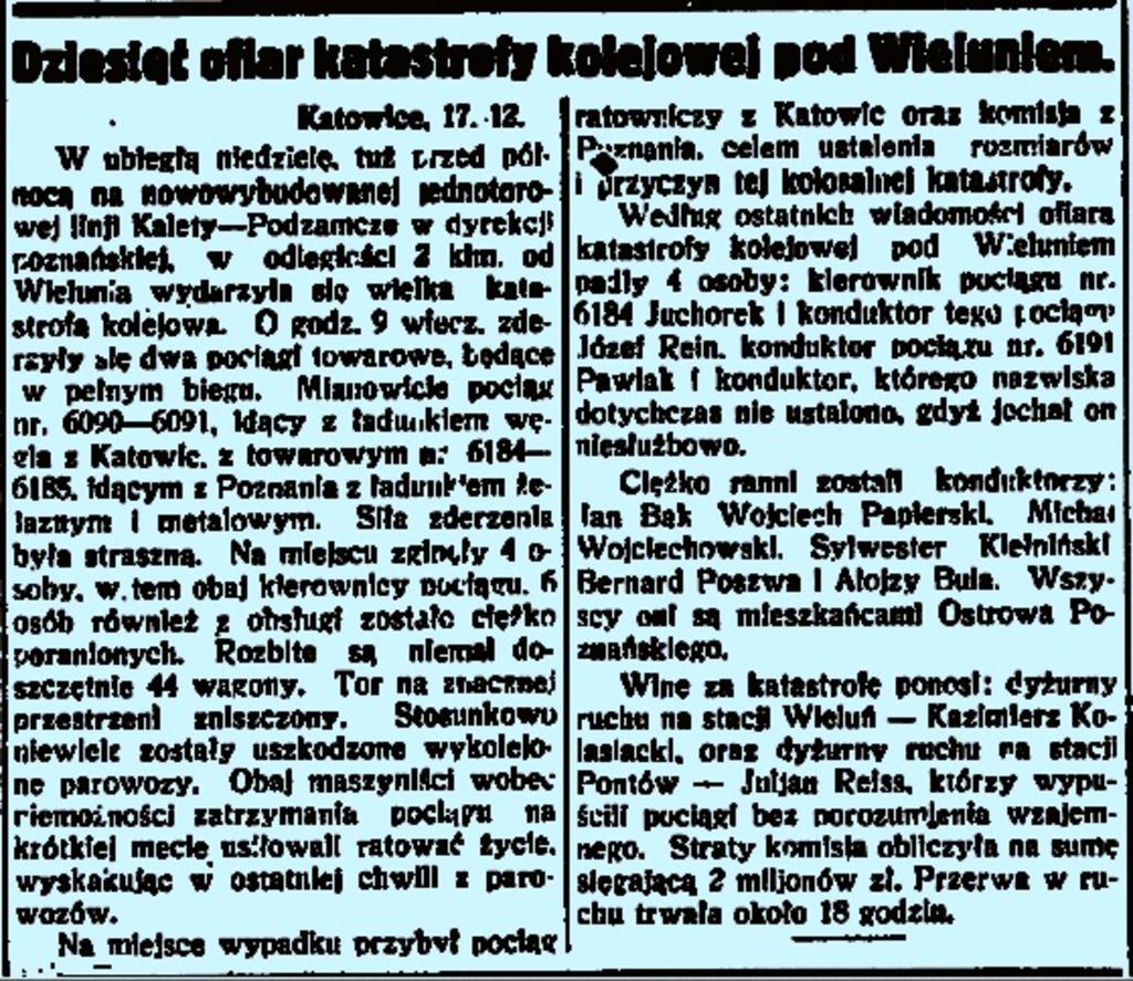 Gazeta z 1928 roku, opis katastrofy pod Wieluniem.
