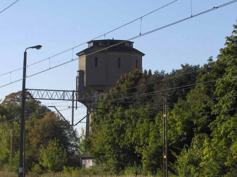 Wieluń Dąbrowa. Wieża wodna za torami.