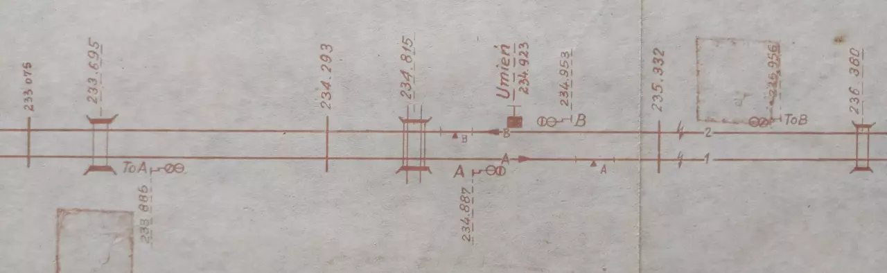 Przystanek osobowy Umień pojawił się na linii nr 131 (Chorzów Batory - Tczew) w SRJP "lato 1949", tabela nr 224. Zlokalizowany był pomiędzy stacjami Dąbie nad Nerem i Ponętów. Według tabeli odległości, od Dąbia dzieliło go 5 km., zaś od Ponętowa 6. W tabeli linii 131 powinien więc znajdować się w okolicach 234 kilometra. Ostatni raz przystanek ten pojawiał się w SRJP "zima 1953-1954", tabela nr 392. Co ciekawe nigdy nie został uruchomiony. Przez cały okres istnienia nie przyjął ani jednego pociągu pasażerskiego. Na mapach satelitarnych nie widać, aby kiedyś miałaby tam funkcjonować choćby ładownia. (info: polo; 2017-02-04) |