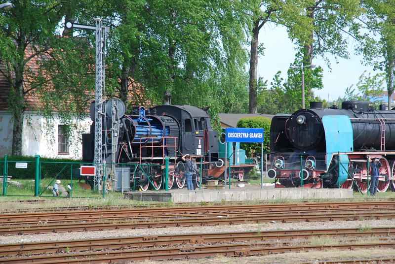 Kościerzyna. Widok na skansen, a w oddali budynek dworca.