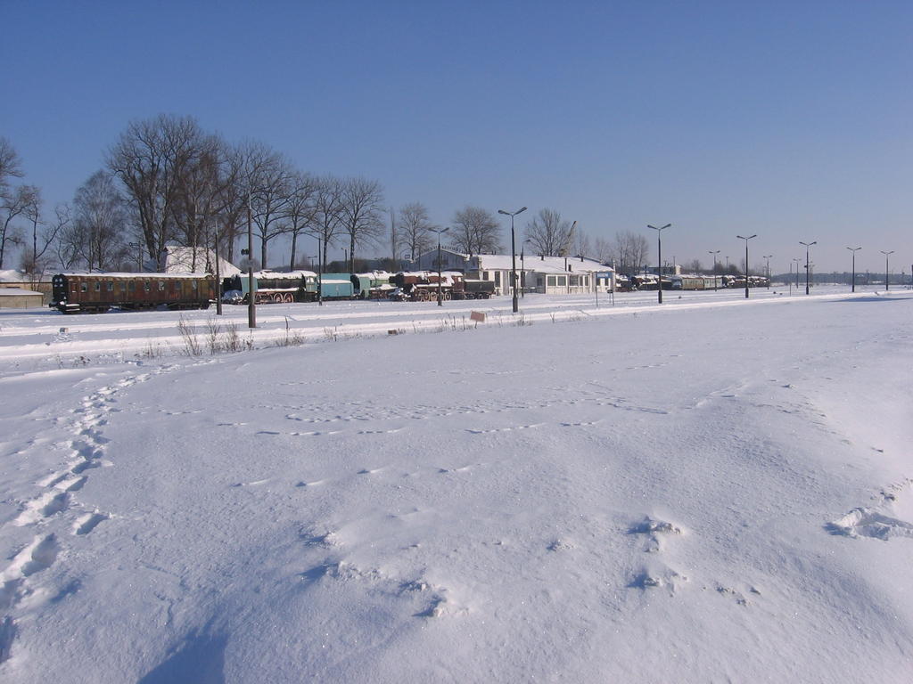 Kościerzyna zimą. Widok na skansen kolejowy.