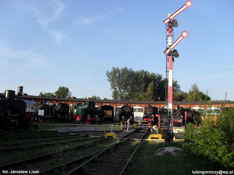 Widok ogólny na skansen w jaworzyńskiej parowozowni. Na pierwszym planie tory wyjazdowe w kierunku Świdnicy.