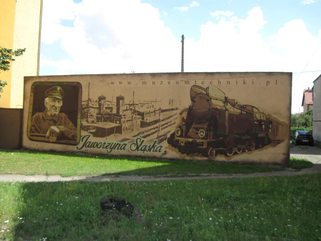 Jaworzyna Śląska ul 1-go Maja. Informacja o Muzeum Przemysłu i Kolejnictwa na Śląsku.