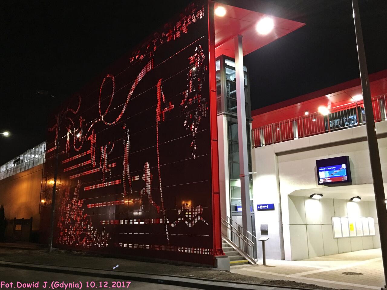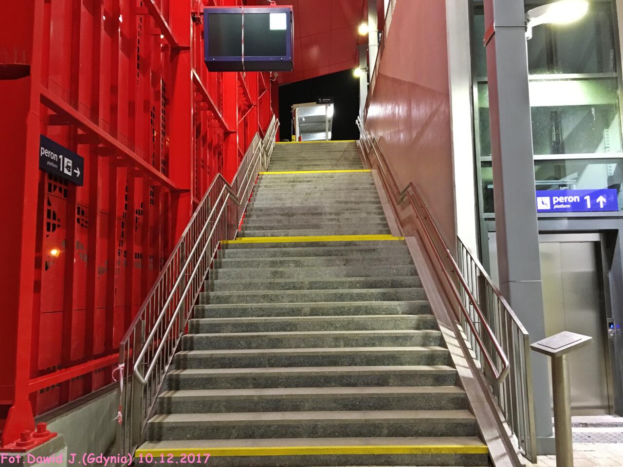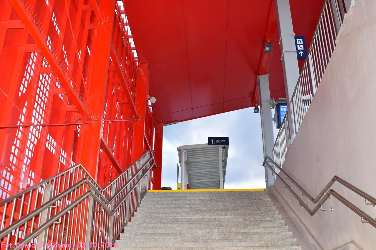Wejście na peron 1. Ozdobna czerwona wiata. W lewo Gdańsk Osowa/Bydgoszcz Główna, w prawo Gdynia Główna.