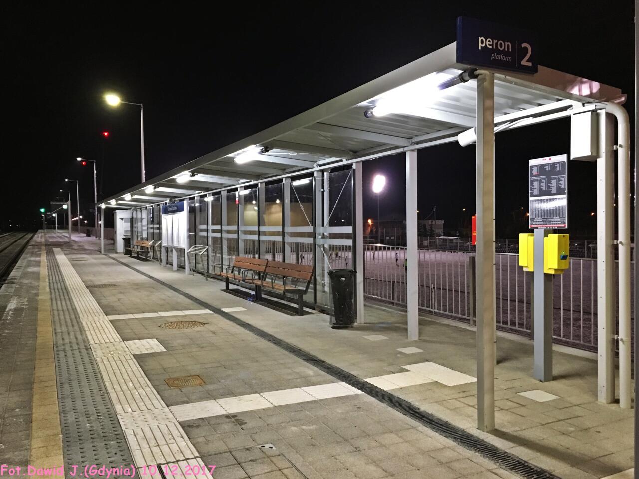 Widok z końca peronu 1 w kierunku Gdyni Głównej. Wiata dla podróżnych.