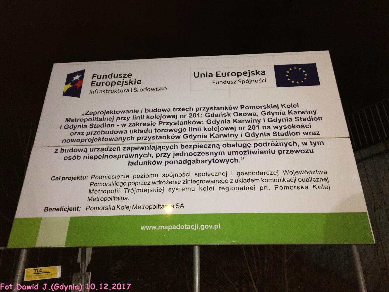 Widok z peronu 2 w kierunku Gdyni Głównej. Tablica z nazwą przystanku osobowego.