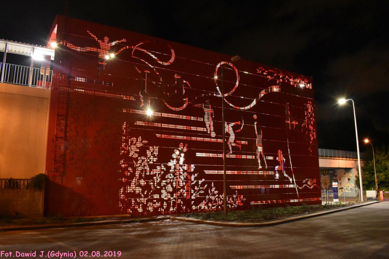 Grafika perforacji na ozdobnej czerwonej wiacie przystanku Gdynia Stadion nawiązuje do dyscyplin sportowych uprawianych na obiektach sąsiadujących z koleją. W lewo Gdańsk Osowa/Bydgoszcz Główna, w prawo Gdynia Główna.