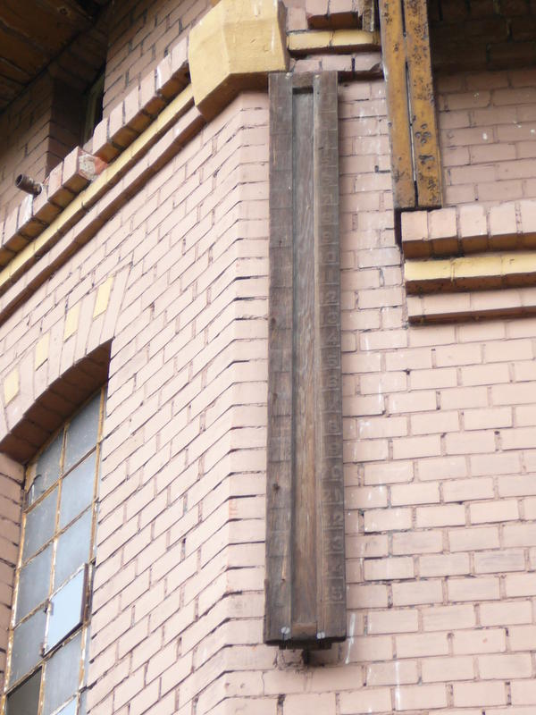 Nowa Wieś Grodziska. Wieża wodna, zachowany jeszcze wskaźnik poziomu wody w zbiorniku.