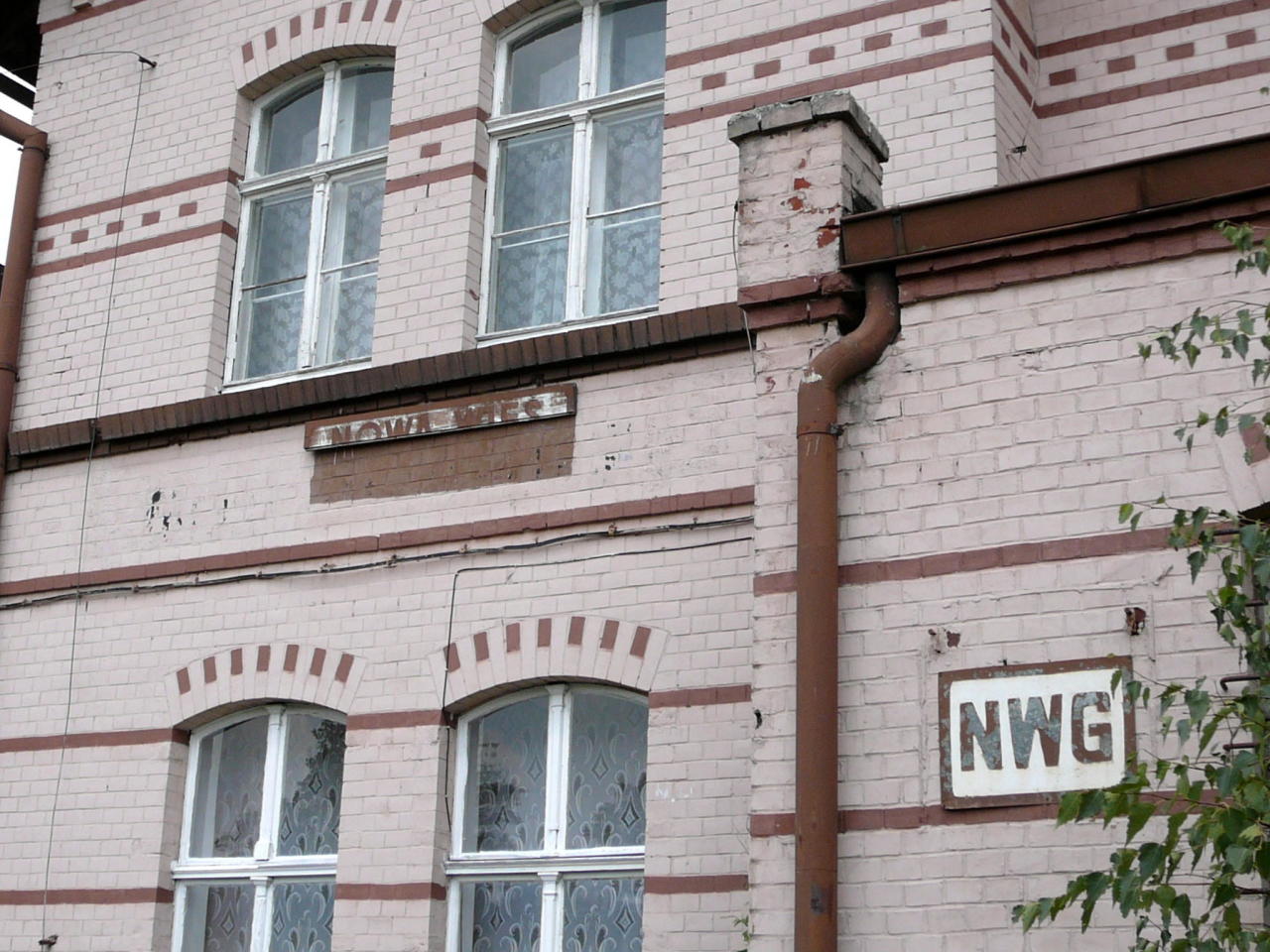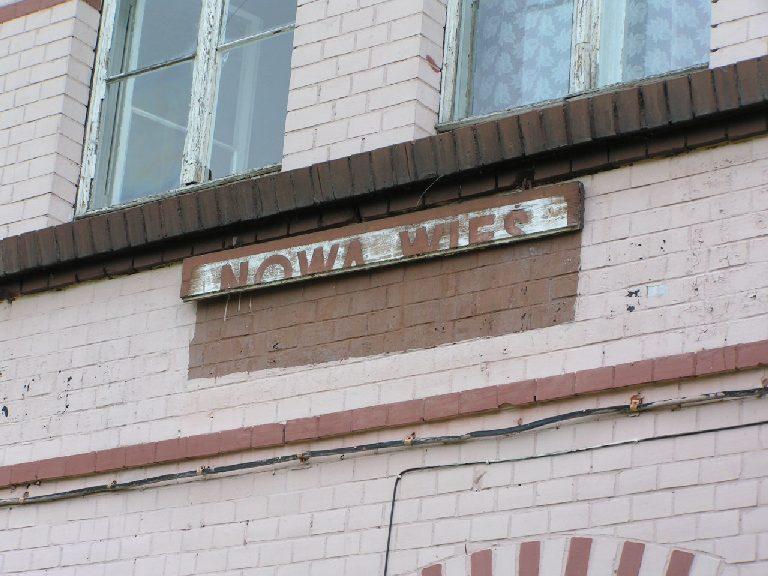Resztka tablicy z nazwą stacji na budynku dworca.
