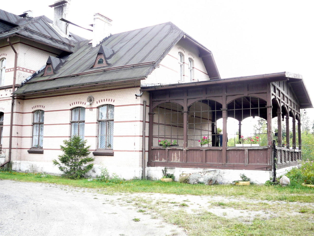 Nowa Wieś Grodziska. Część budynku dworca i poczekalnia letnia od strony podjazdu.