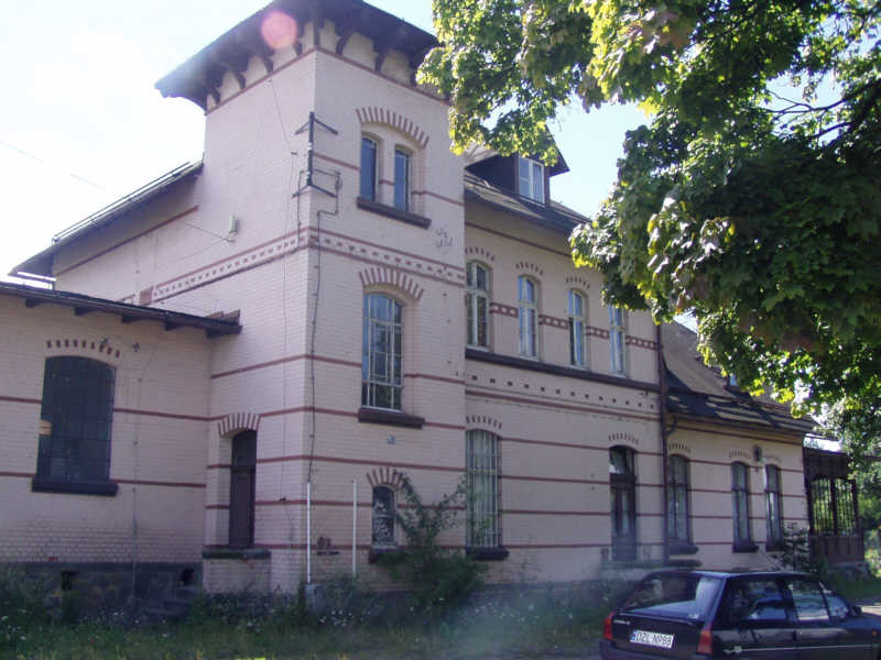 Zabudowania nieczynnej stacji od strony peronów, od lewej: budynek gospodarczy, toalety i dworzec mieszczący dawniej nastawnię dysponującą. Widok w kierunku wschodnim, od strony wjazdu z Lwówka Śląskiego.