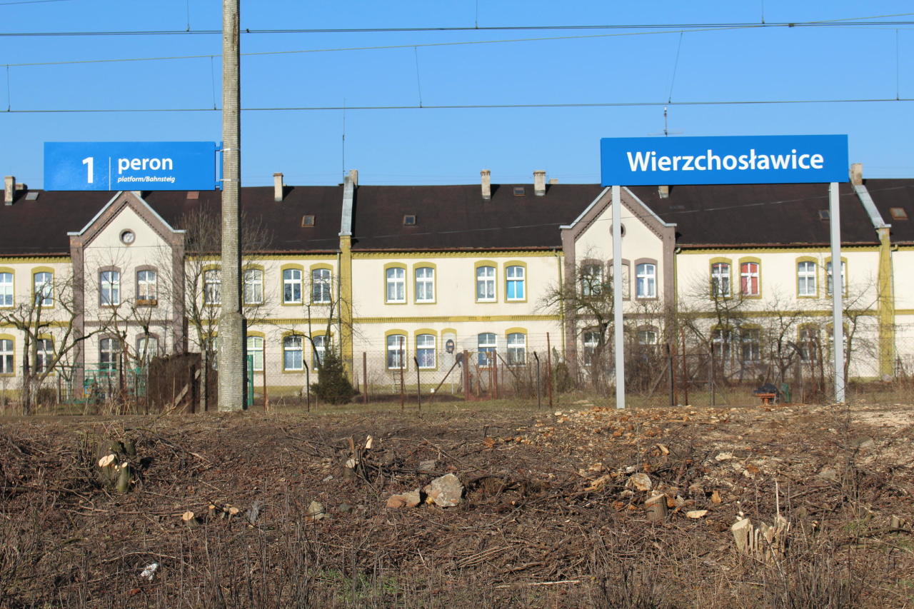 Widok na stację w Wierzchosławicach, z prawej strony sporadycznie używana bocznica firmy CYKORIA S.A. Kierunek Inowrocław.