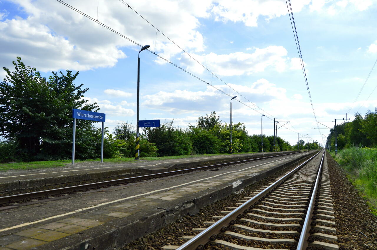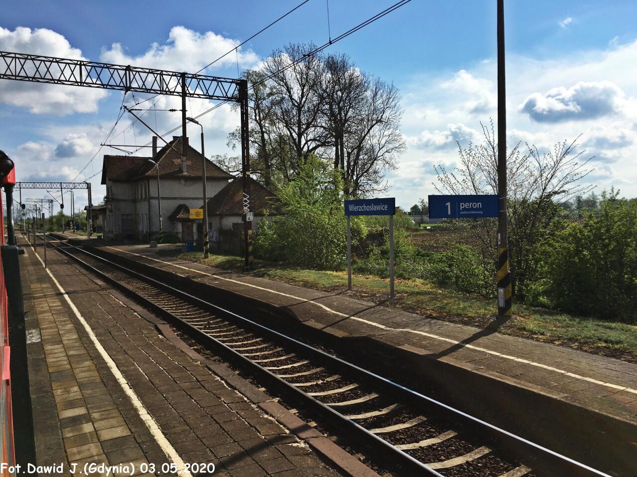 Dworzec Wierzchosławice wiosną. Godzina 18:40. Dworzec w pełnej okazałości, z przodu tory linii 353. W lewo Toruń, w prawo Inowrocław.