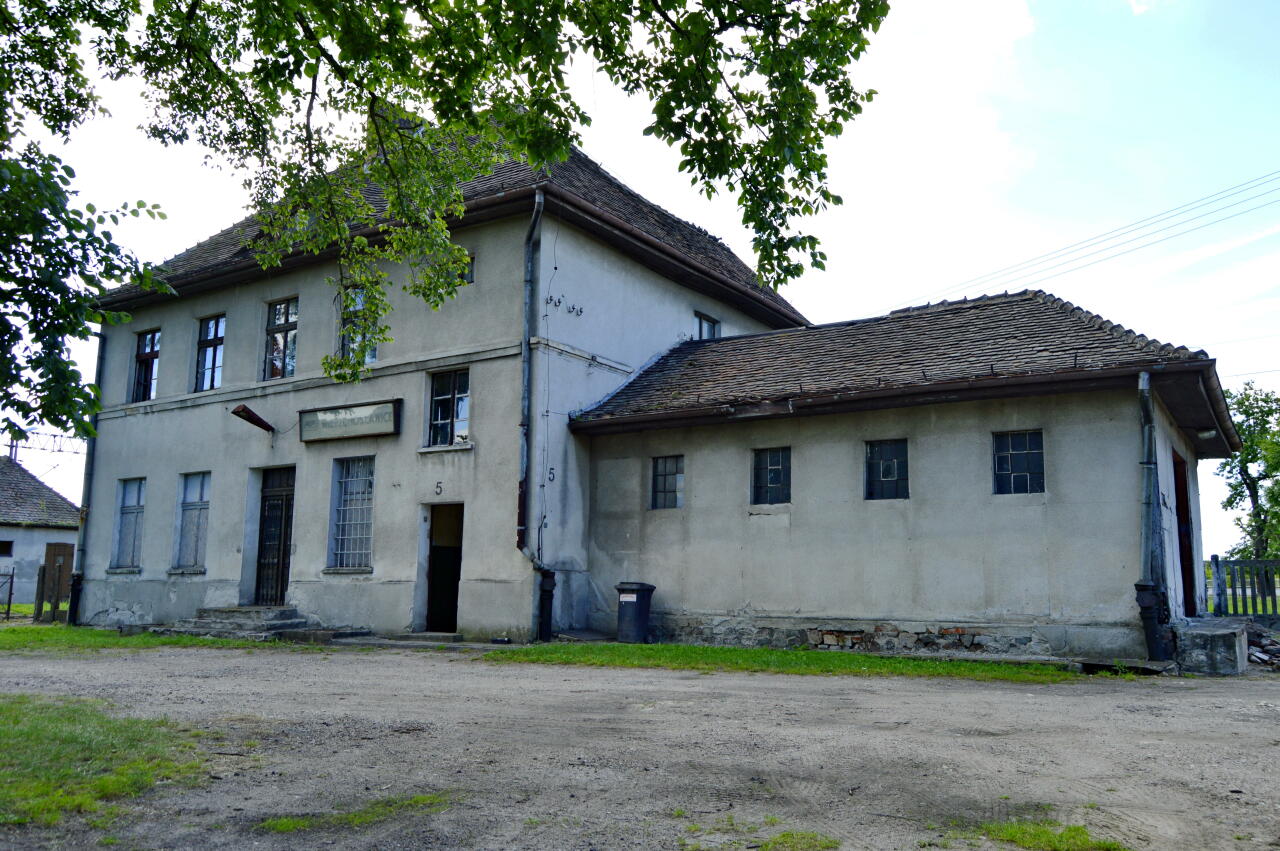Wierzchosławice. Zamknięty budynek dworcowy od strony podjazdu.