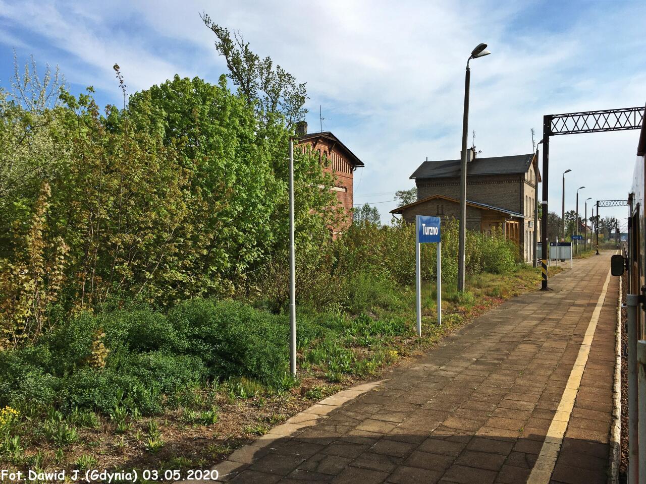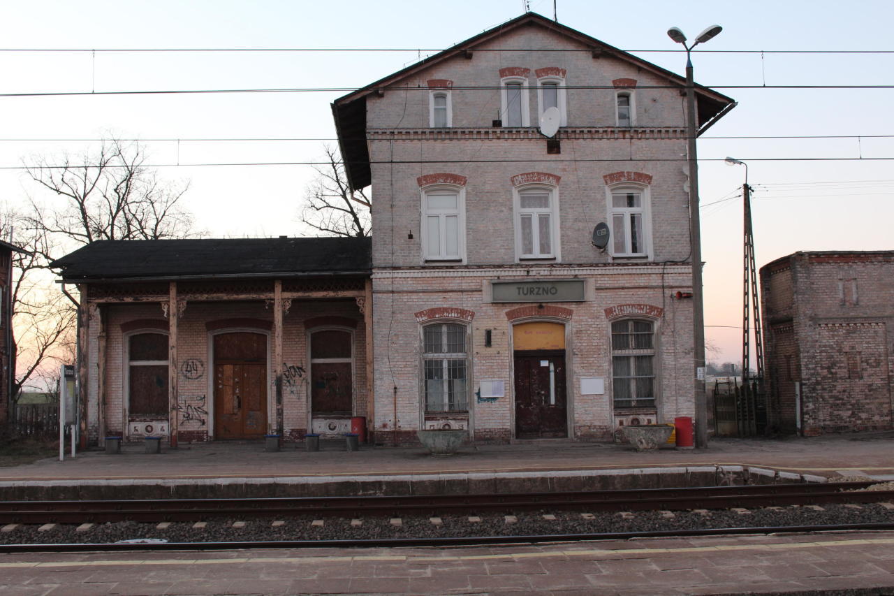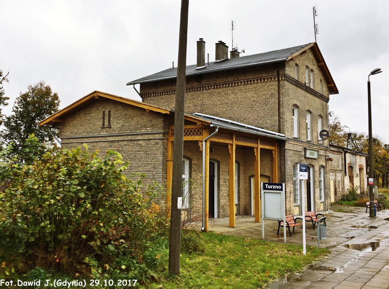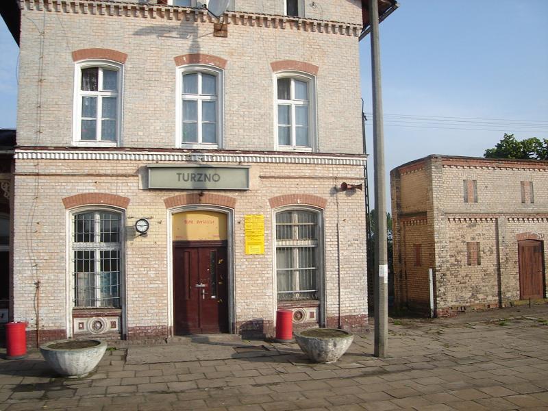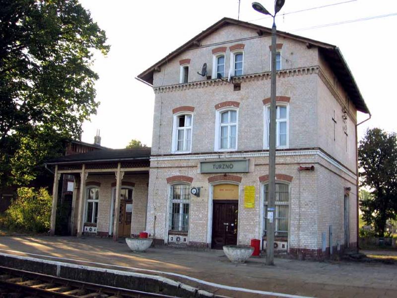 Turzno. Widok na peron 1, budynek dworca i magazyn towarowy od strony Kowalewa Pomorskiego.