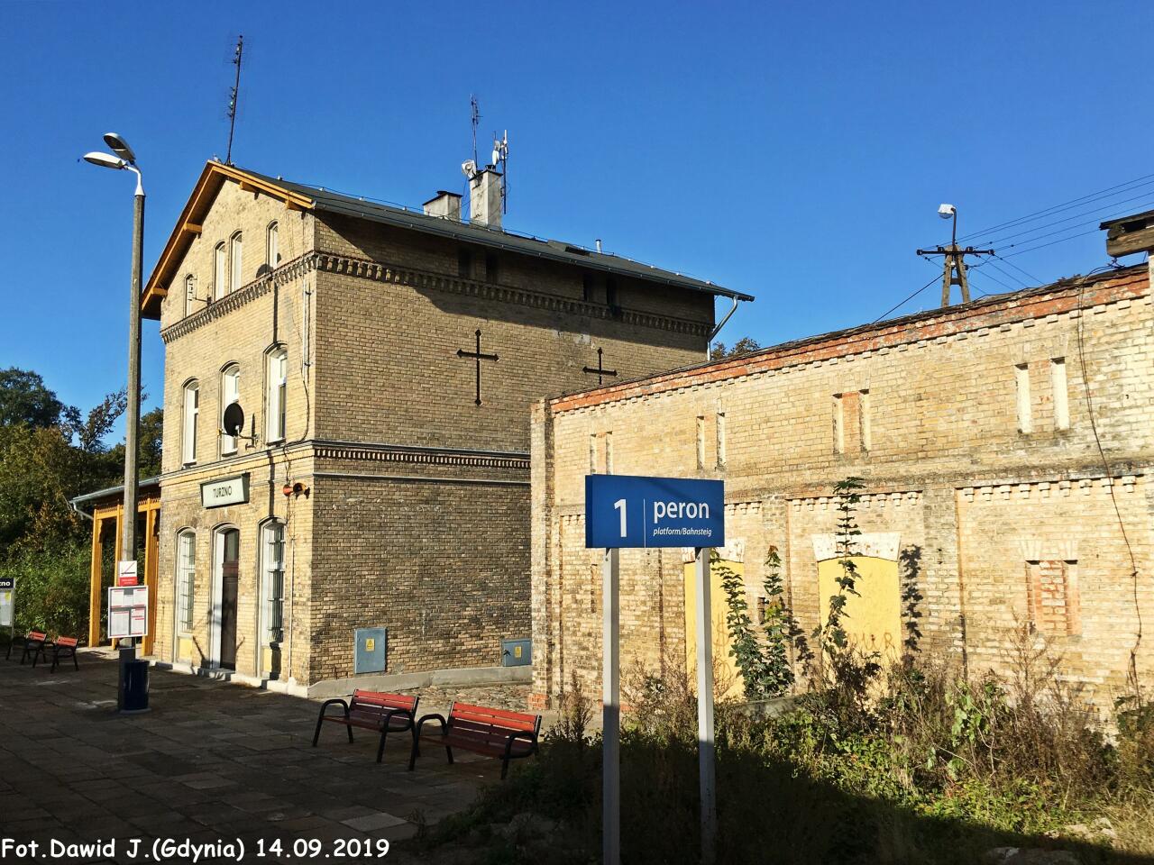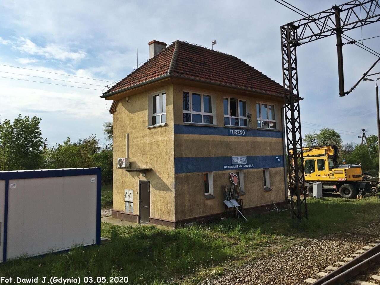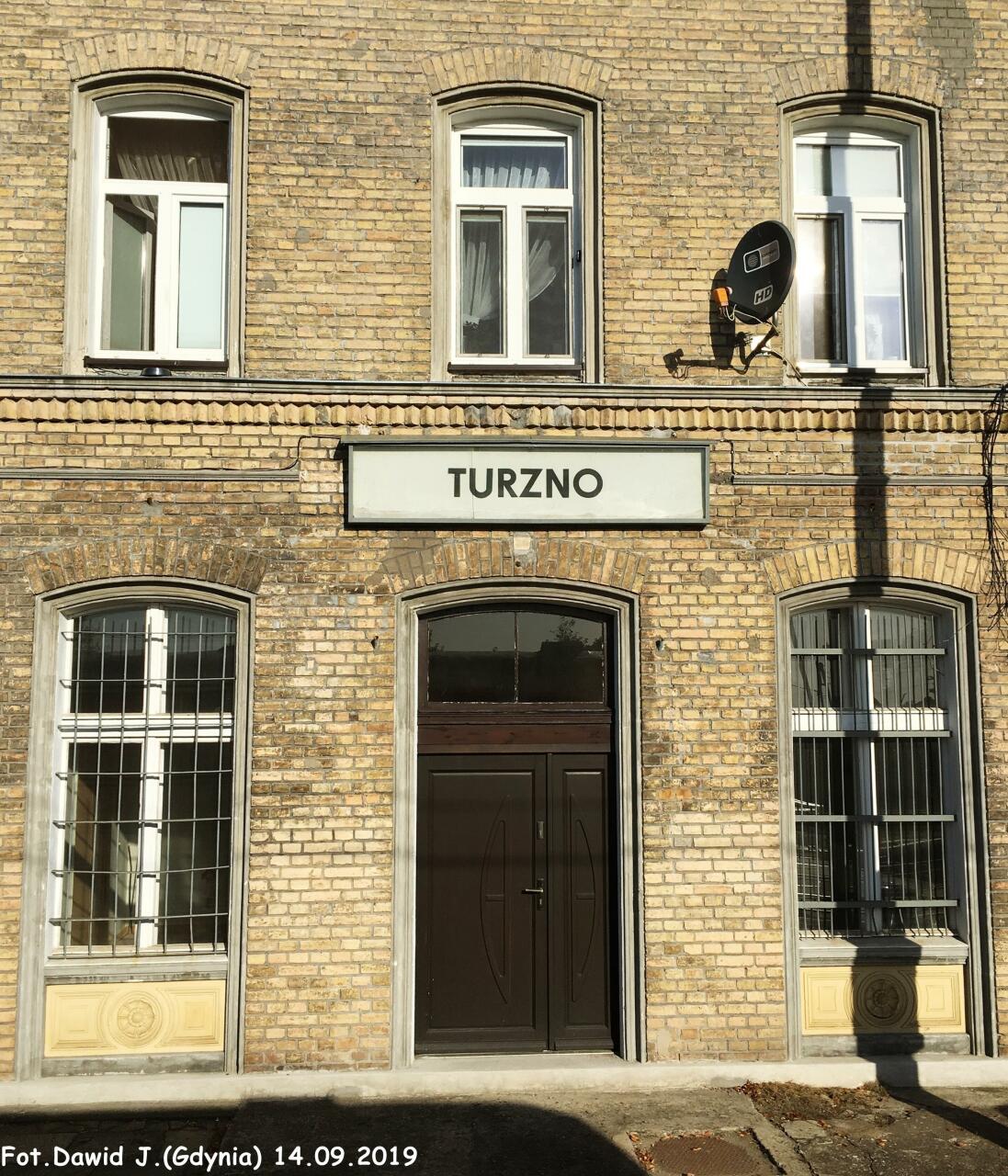 Turzno. Widok na peron 1, budynek dworca i magazyn towarowy od strony Kowalewa Pomorskiego.