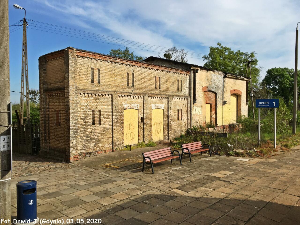 Budynek dworcowy i budynek WC. Obiekty widoczne od strony torów. Widok w kierunku Torunia Wschodniego.