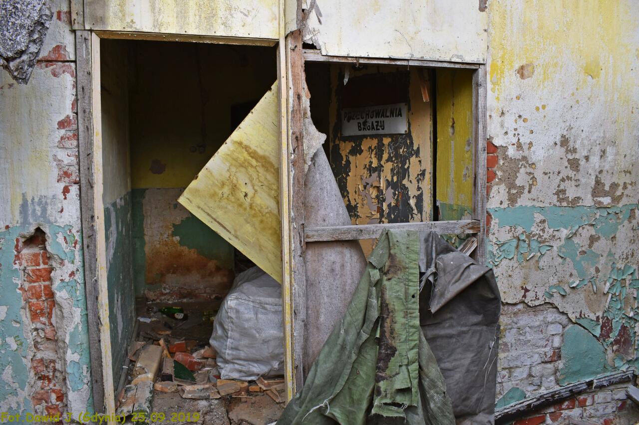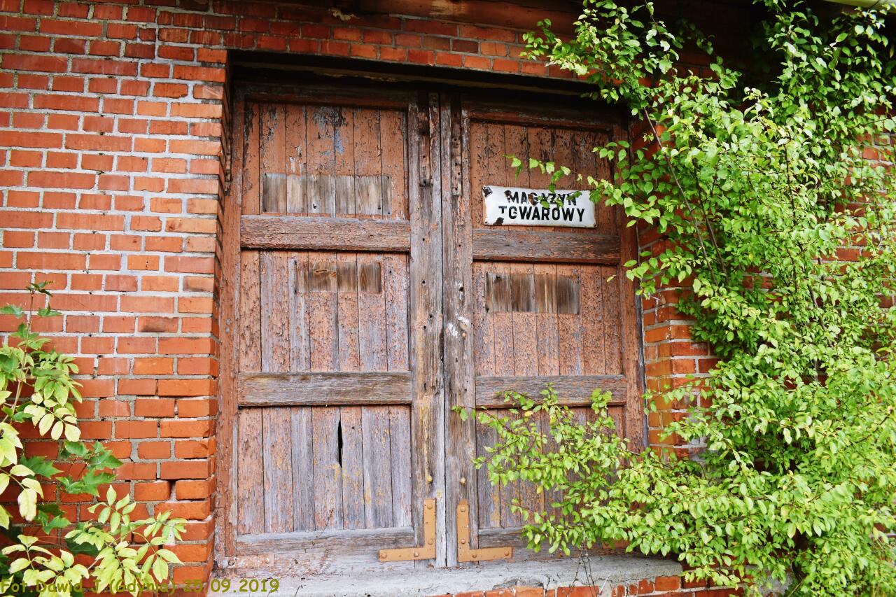 Zamknięte wejście do magazynu towarowego/bagażowego widoczne od strony miejsca, gdzie kiedyś były tory. W lewo Jabłonowo Pomorskie w prawo Kisielice/Prabuty.