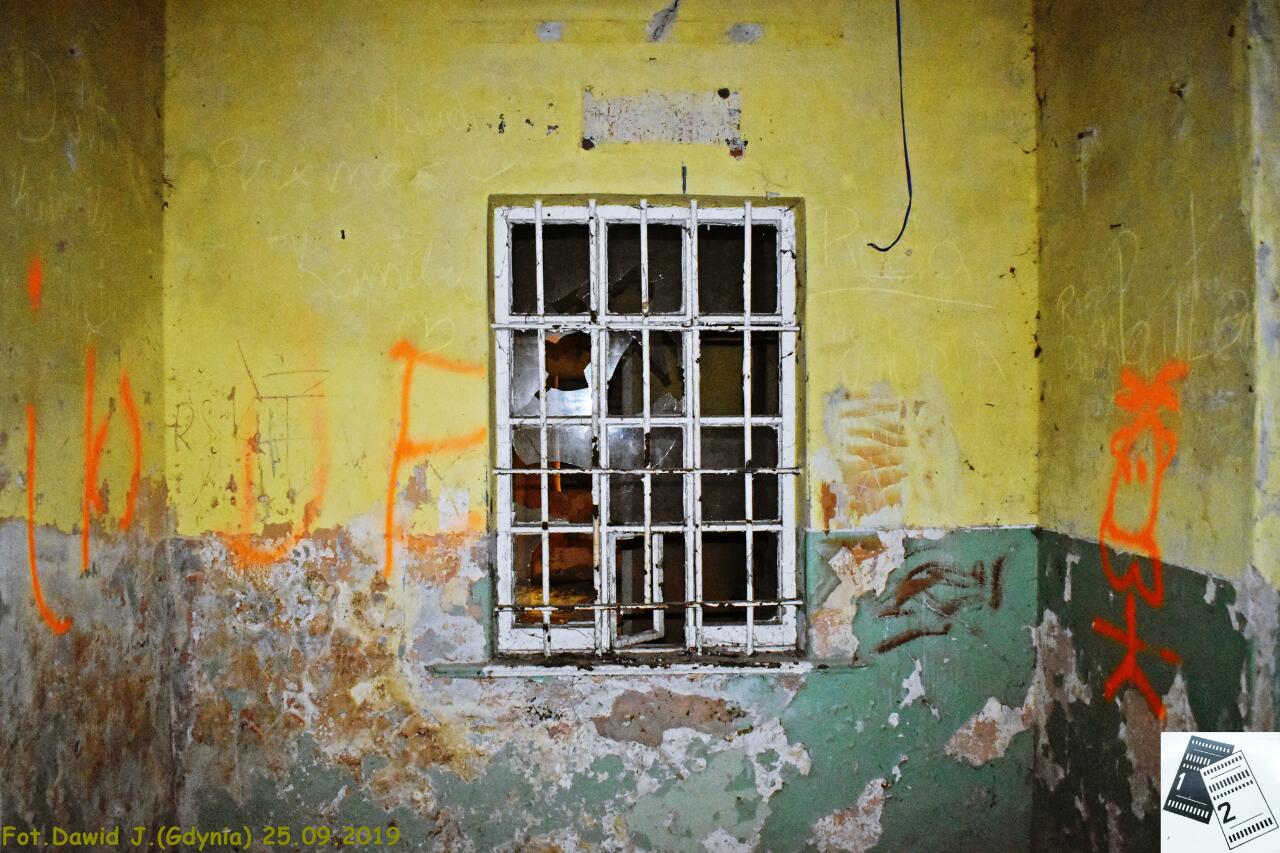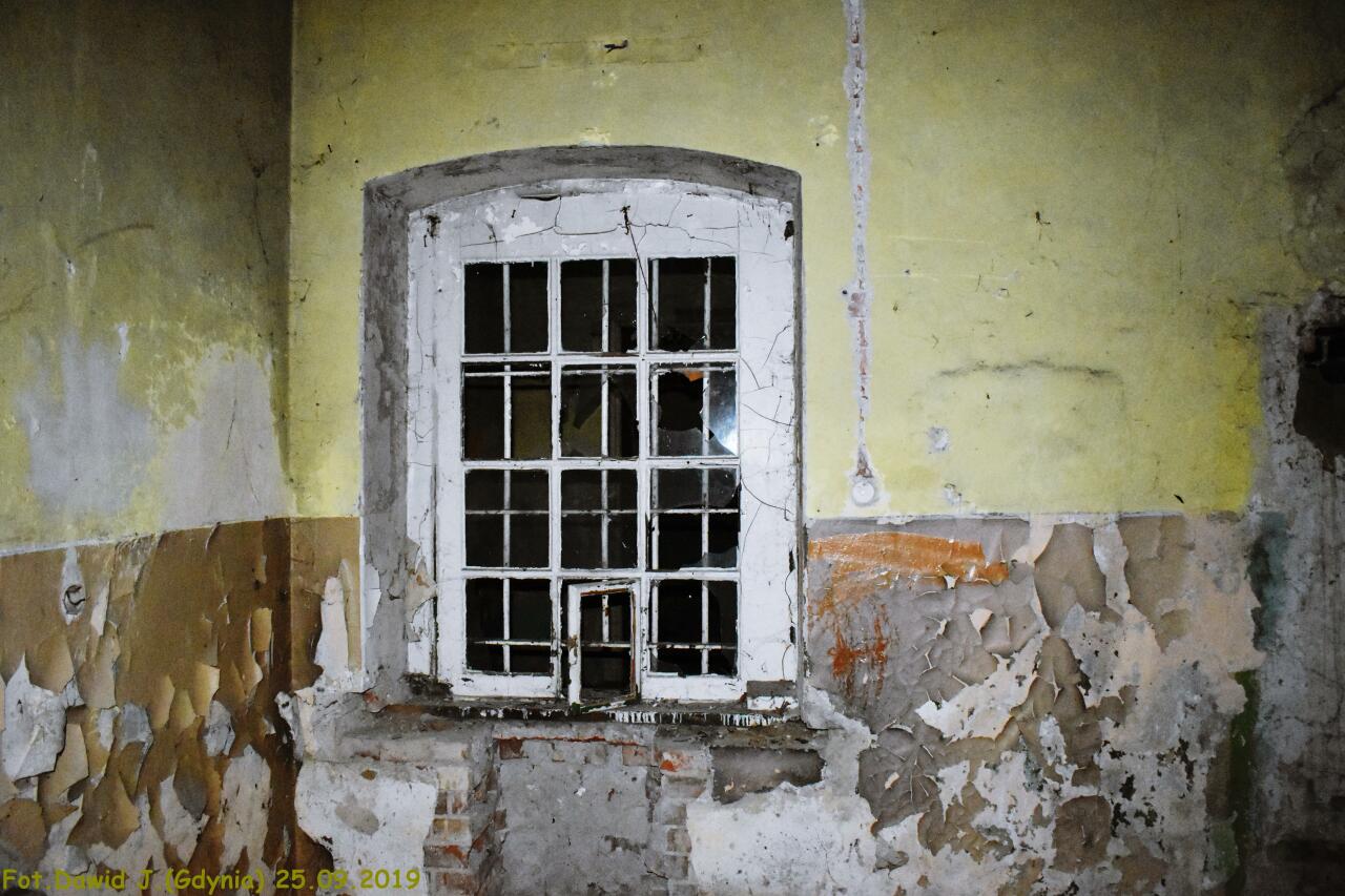 Wnętrze dawnego budynku dworcowego. Pomieszczenie przechowalni bagażu po prawej stronie.