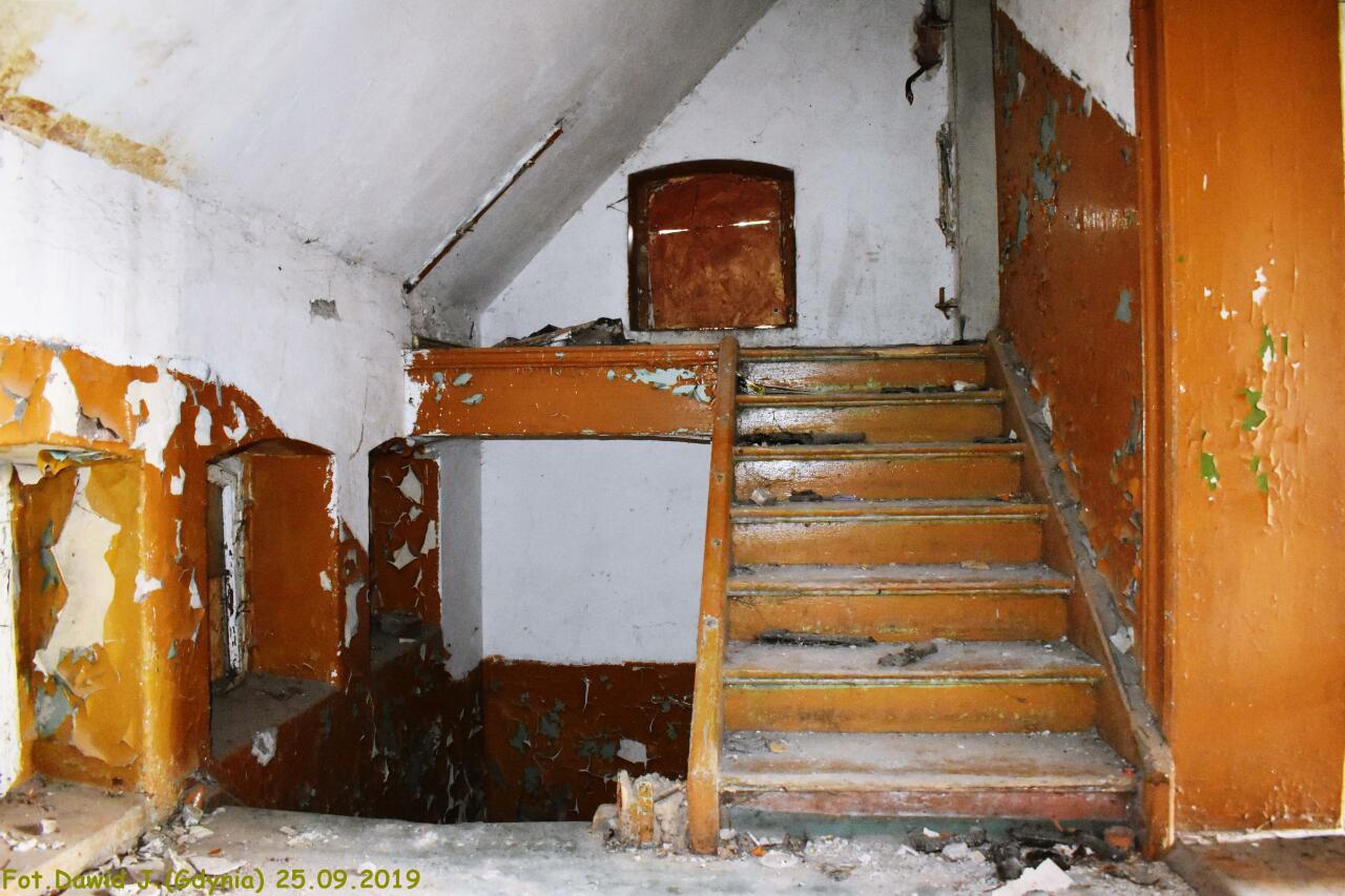 Wnętrze dawnego budynku dworcowego. Piętro 1. Część mieszkalna budynku. Wejście do 2 opuszczonych mieszkań.