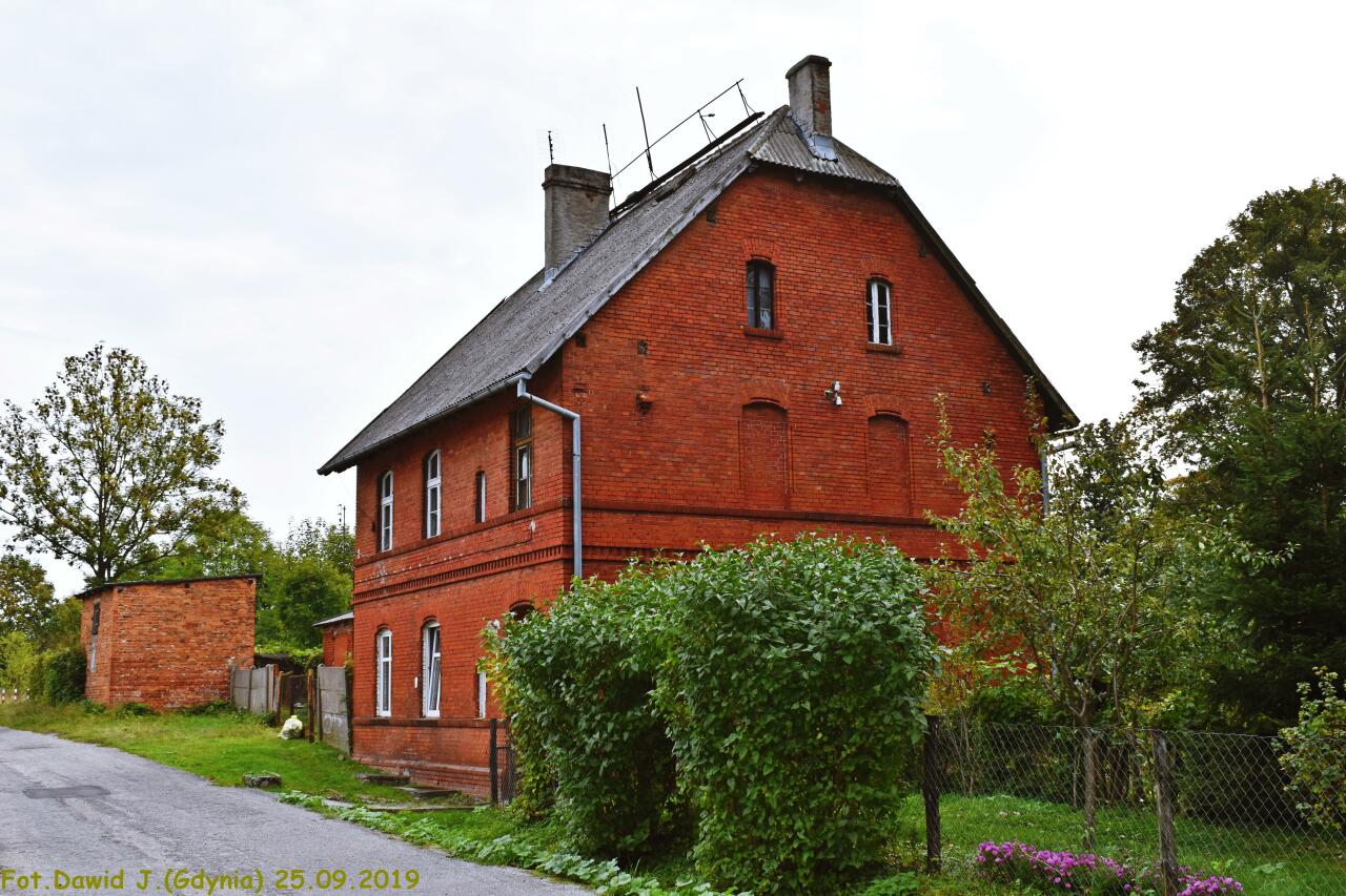 Dawny budynek dworcowy widoczny od strony podjazdu. W tle kolejowy budynek mieszkalny nr 2. Widok w kierunku Kisielic/Prabut.