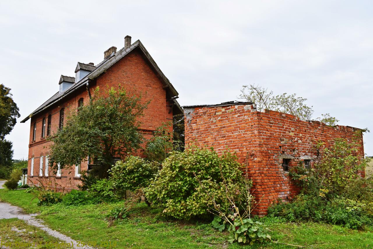 Kolejowy budynek mieszkalny nr 1 z przyległą częścią z pomieszczeniami gospodarczymi, pobliski budynek gospodarczy. Obiekty widoczne od strony podjazdu. Widok w kierunku Kisielic/Prabut.