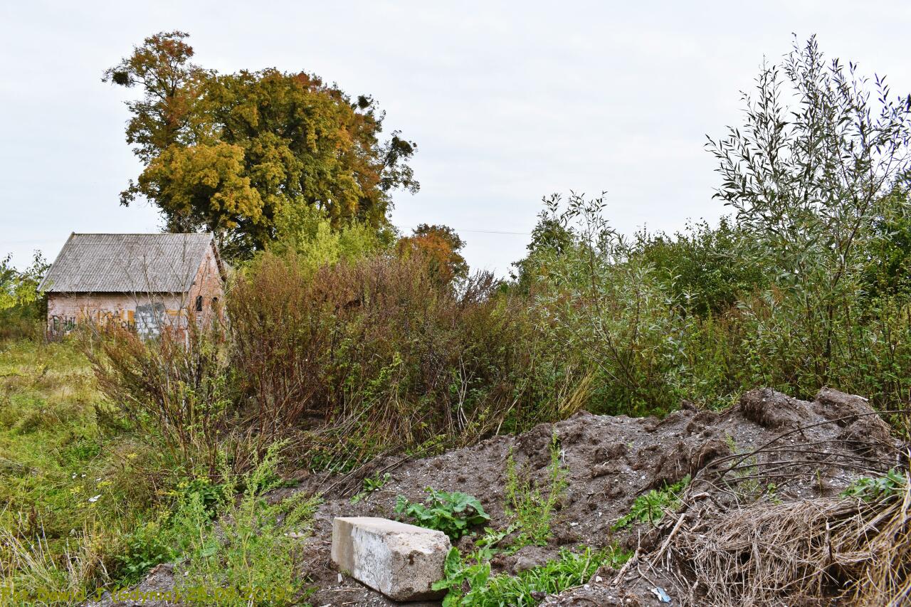Widok z miejsca, gdzie kiedyś były tory w kierunku Kisielic/Prabut. Rozwalony słupek kilometrowy. Budynek WC po lewej stronie.