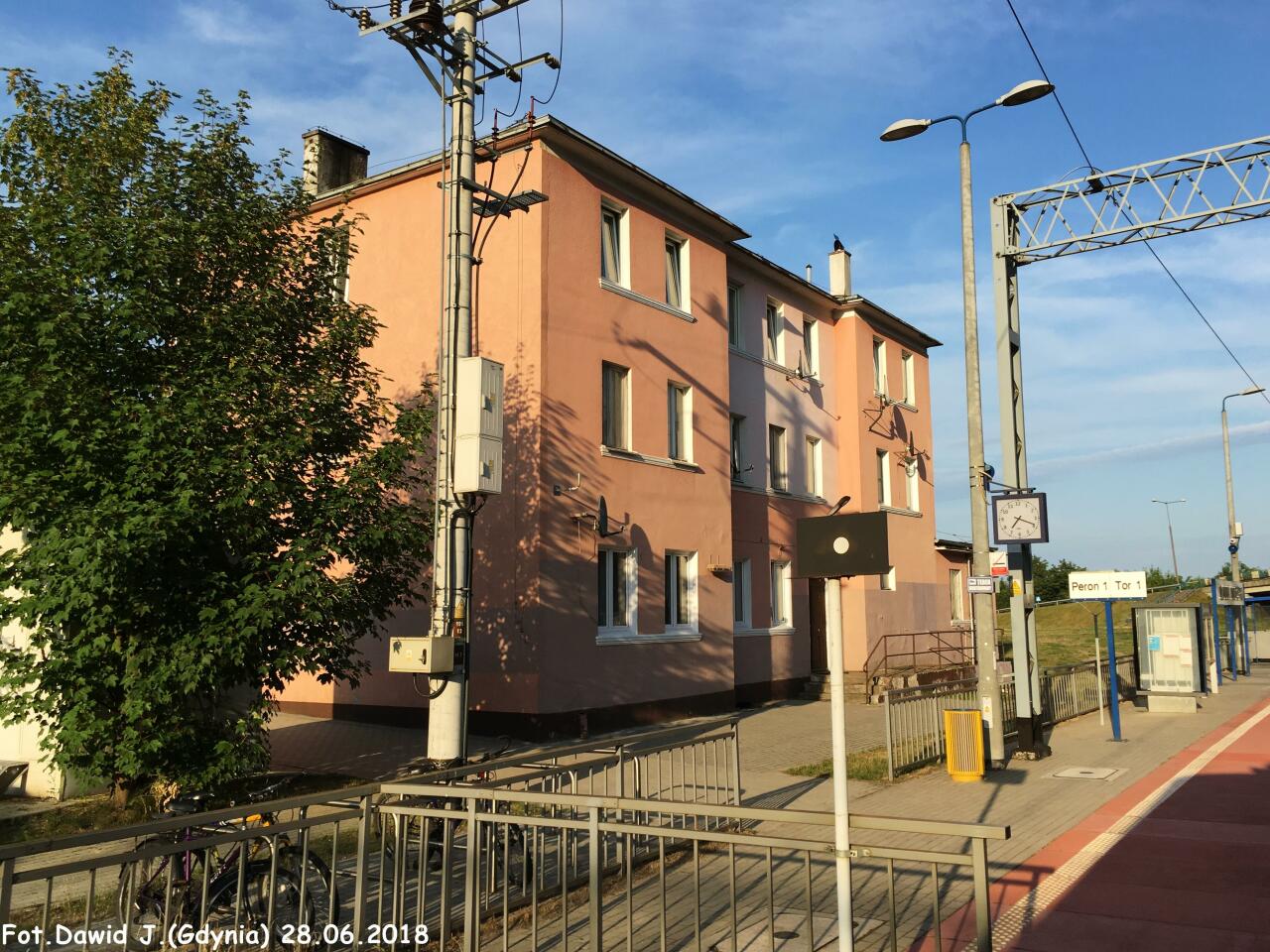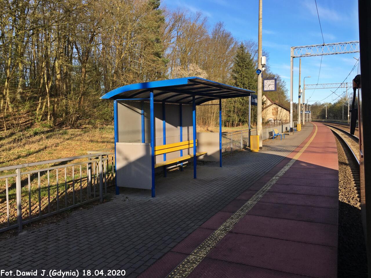 Widok na peron 1 na którym znajduje się wiata dla podróżnych. Budynek dworcowy znajduje się po lewej stronie. W lewo Prabuty i Malbork, w prawo Iława Główna.